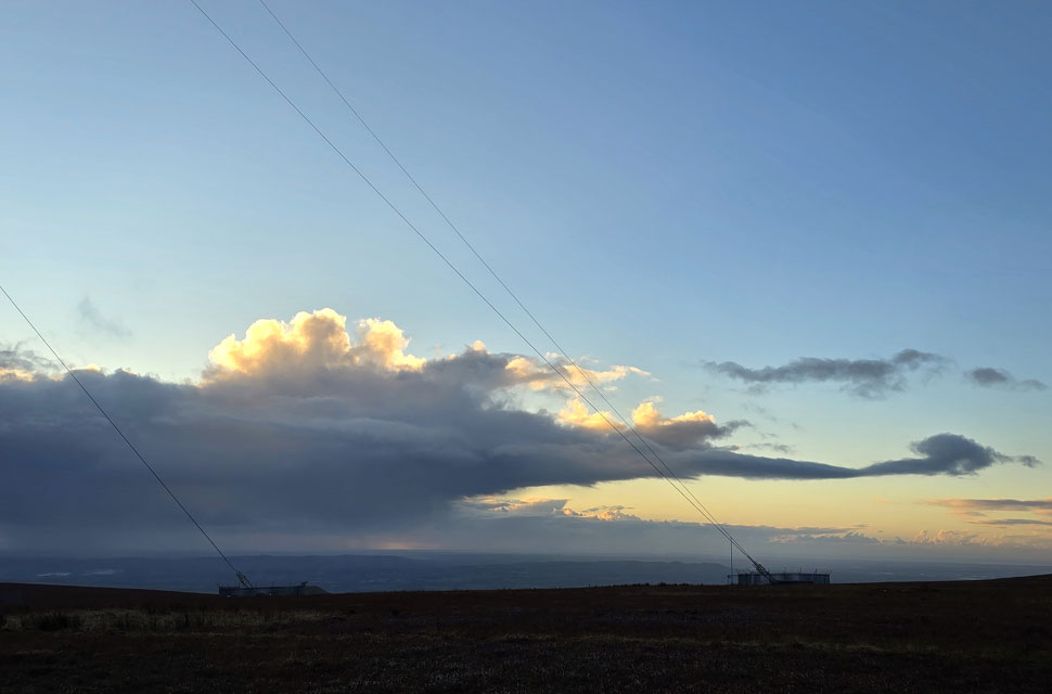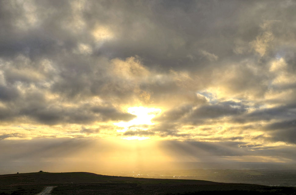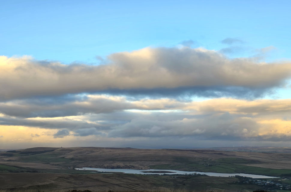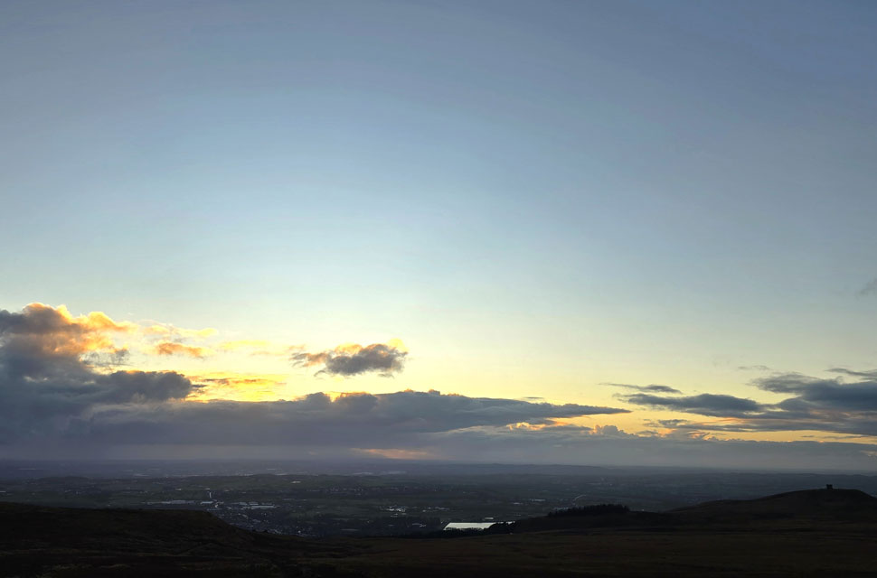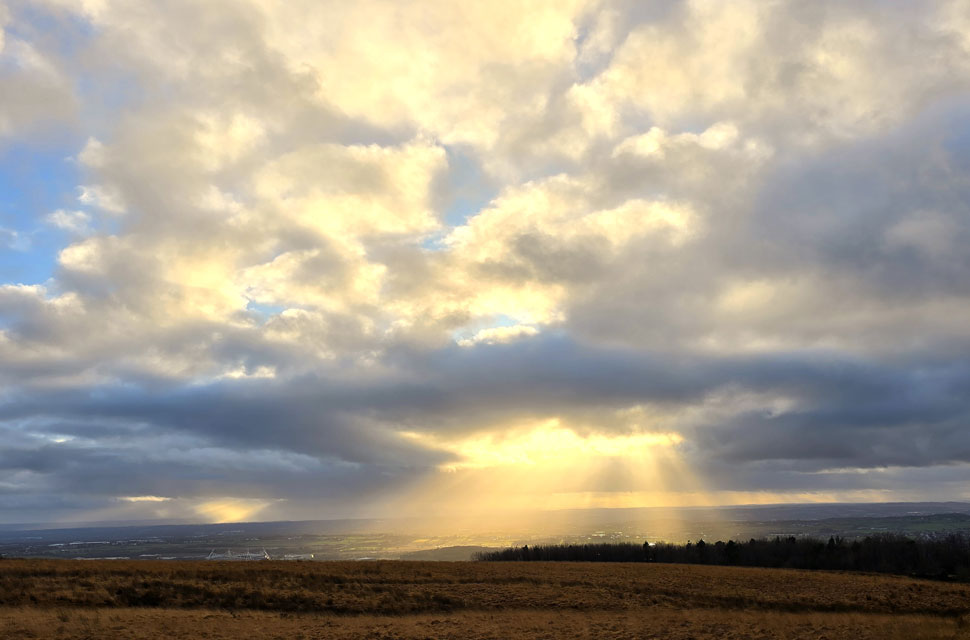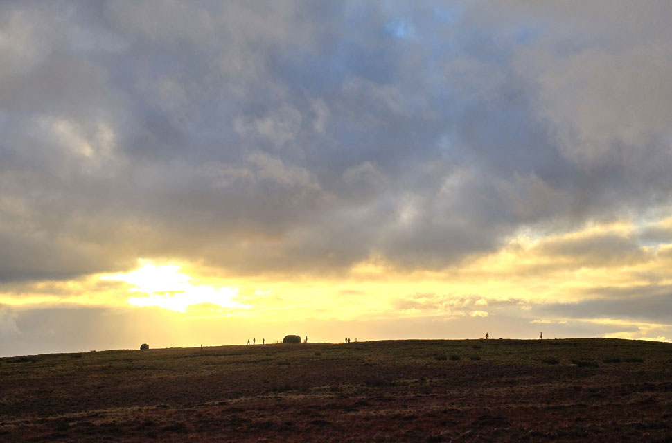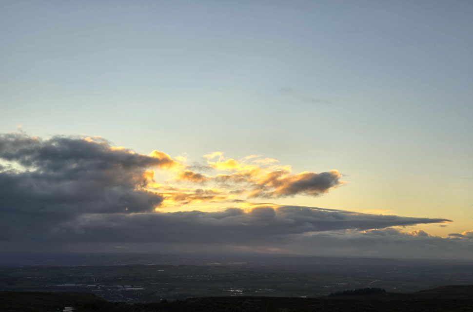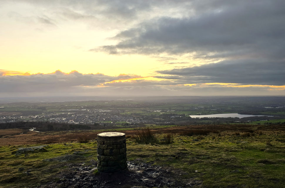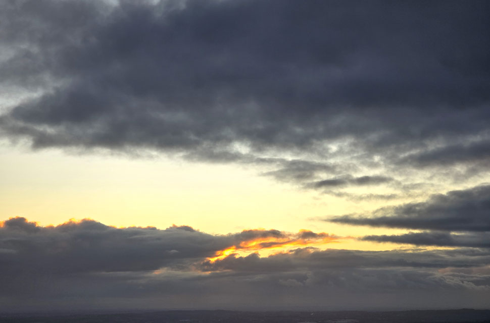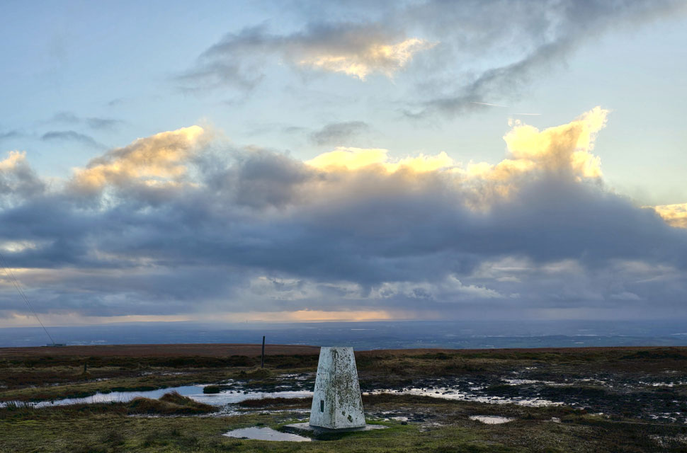 Anyway, as you can see the sun has sunk into more cloud but it's still pretty clear for now. Note the two rain showers either side of the trig point, some poor sod is looking up thinking why am I getting wet when there's blue skies over head. That's January for you. |