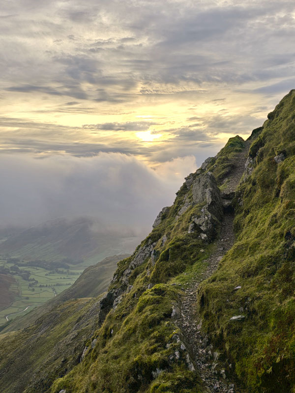 The same walkers we had viewed from our lunch spot back on Rossett Pike were passed as we began our descent, some of these were still sat down as they were earlier but were in jovial spirits as we passed them. Our spirits were up too, how could they not be after a morning of sunrises and cloud inversions but the path underfoot would try its best to beat this out of us, it wouldn't win. We joked about the four thousand steps that we still had to descend and even managed to pick up pace passing walkers in descent while I wondered how the two guys I'd seen on the You Tube video managed to carry their E-bikes up here never mind continue with their epic ride afterwards. Continuing the path that never ends more walkers are passed two of whom stopped to ask "this might seem like a really stupid question but which mountain does this path lead too?" worse still, the lad had a bit of an attitude knowing he hadn't a clue where he was but didn't like being told even though it was them who asked for advice.