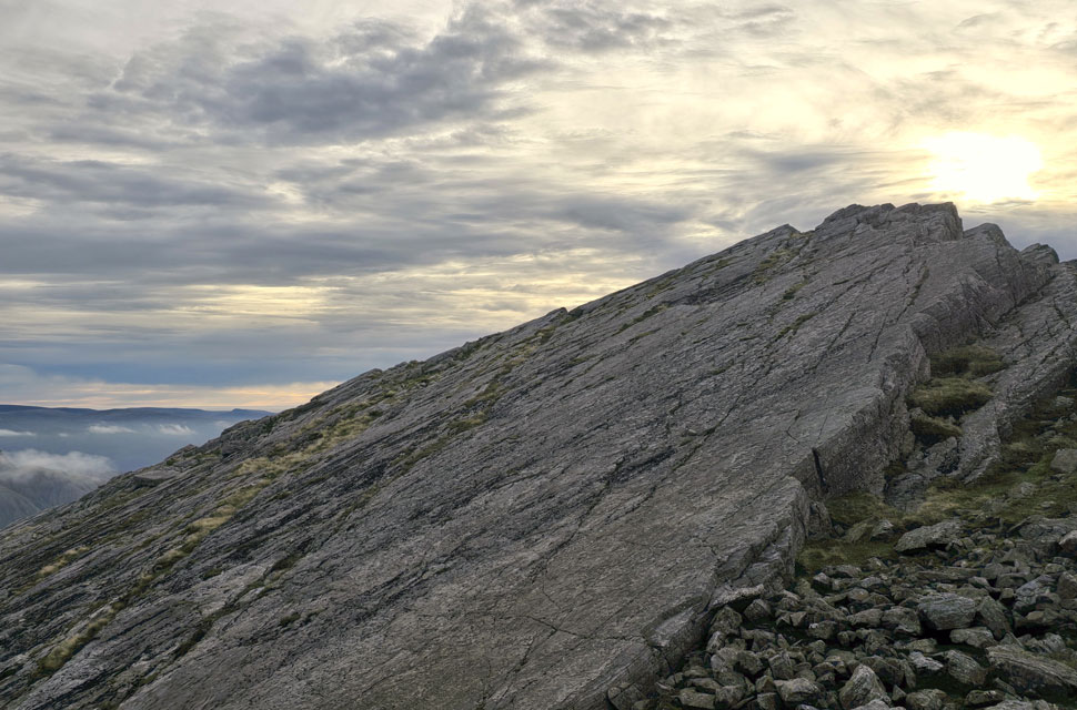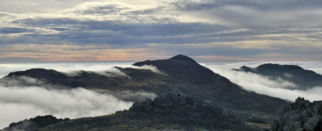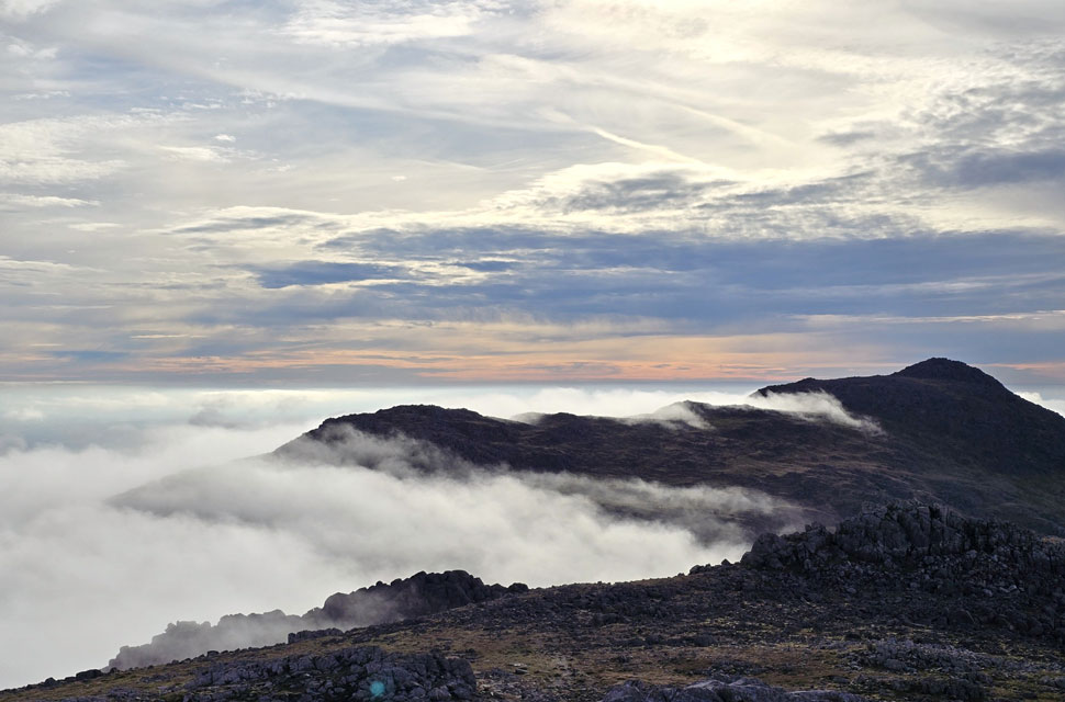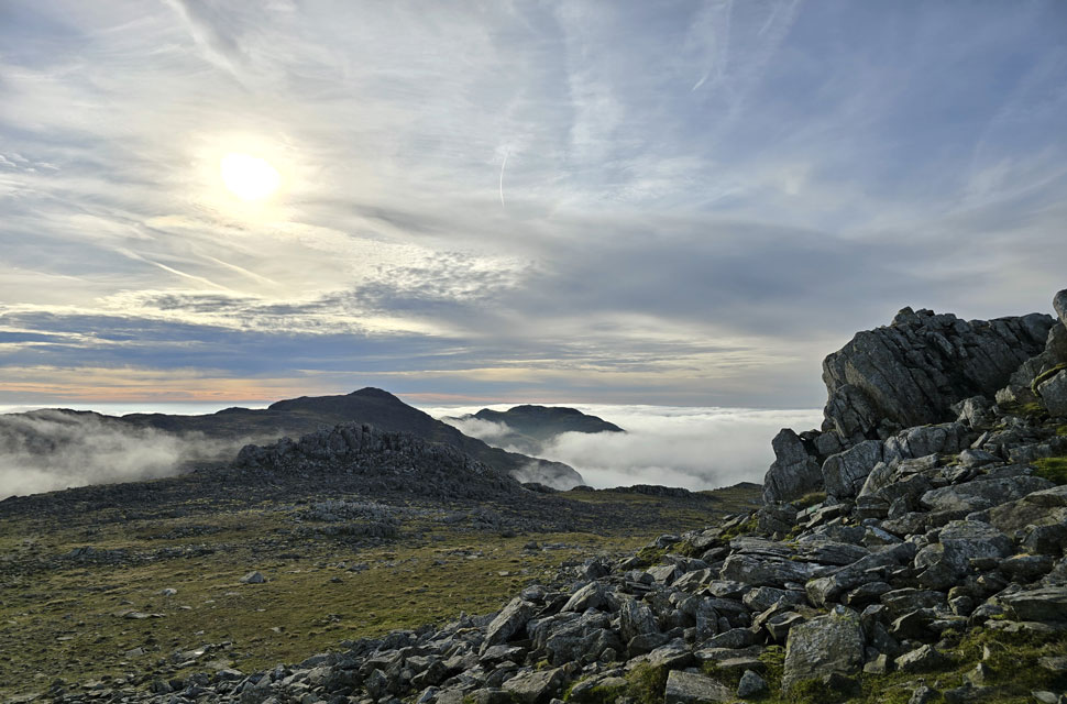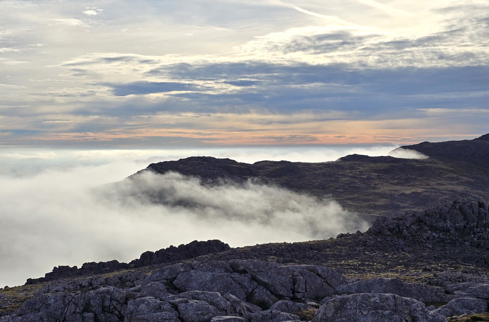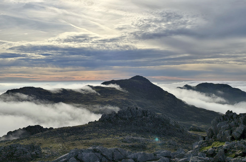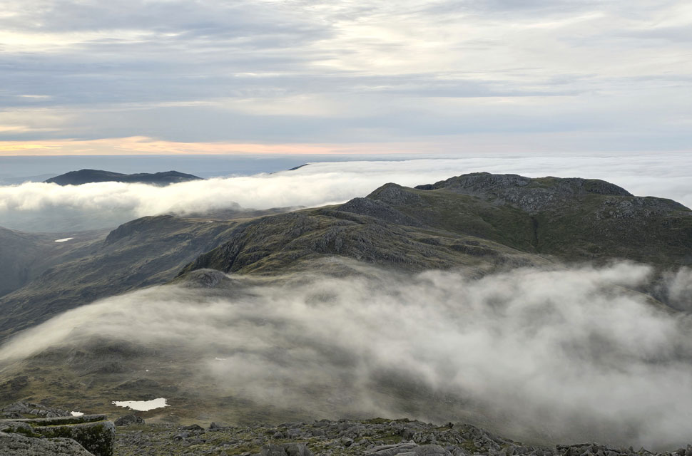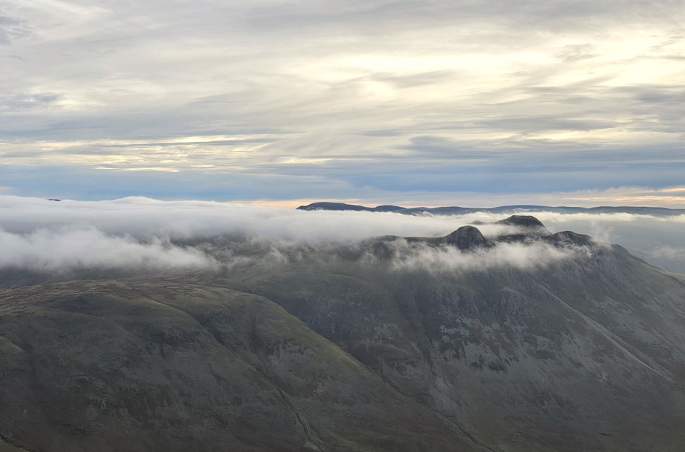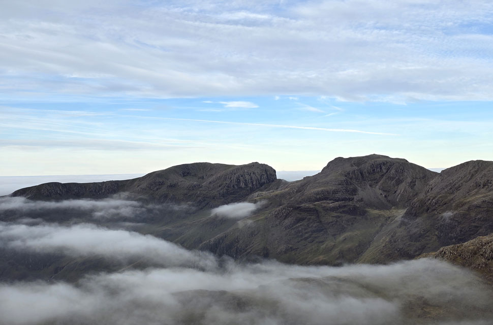 | It hadn't gone unnoticed that although the cloud inversion hadn't quite reached the Scafell / Bow Fell groups it was certainly advancing as we watched the cloud envelop the Pike de Bield ridge below. |