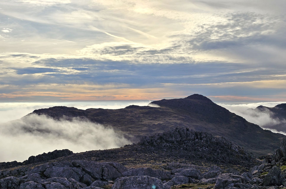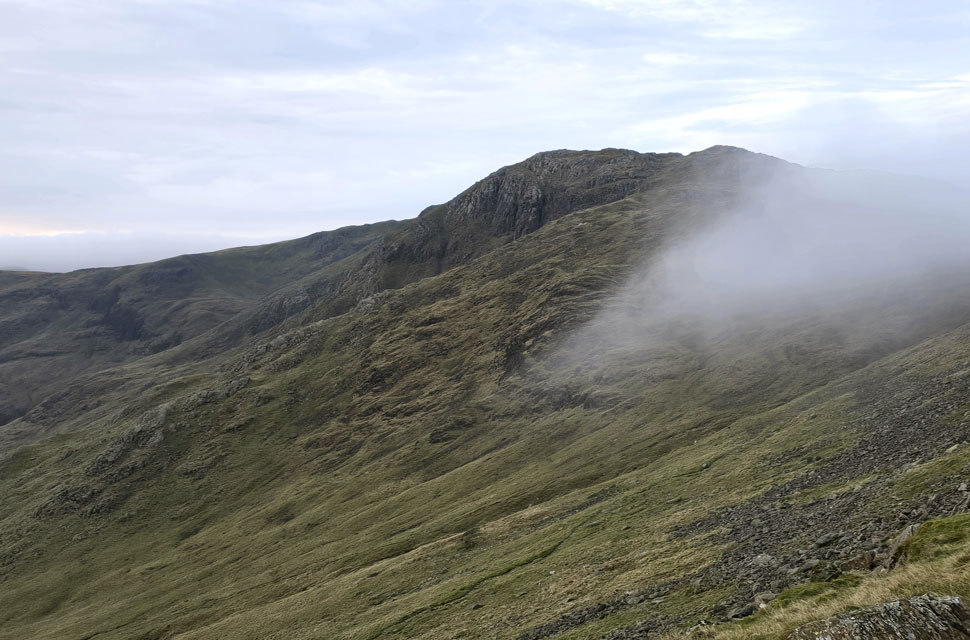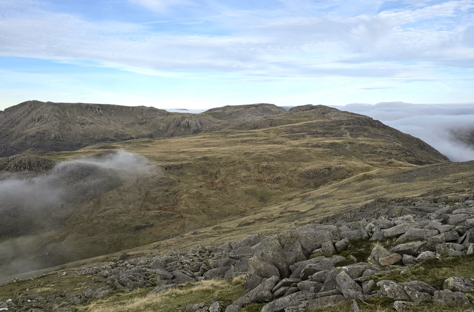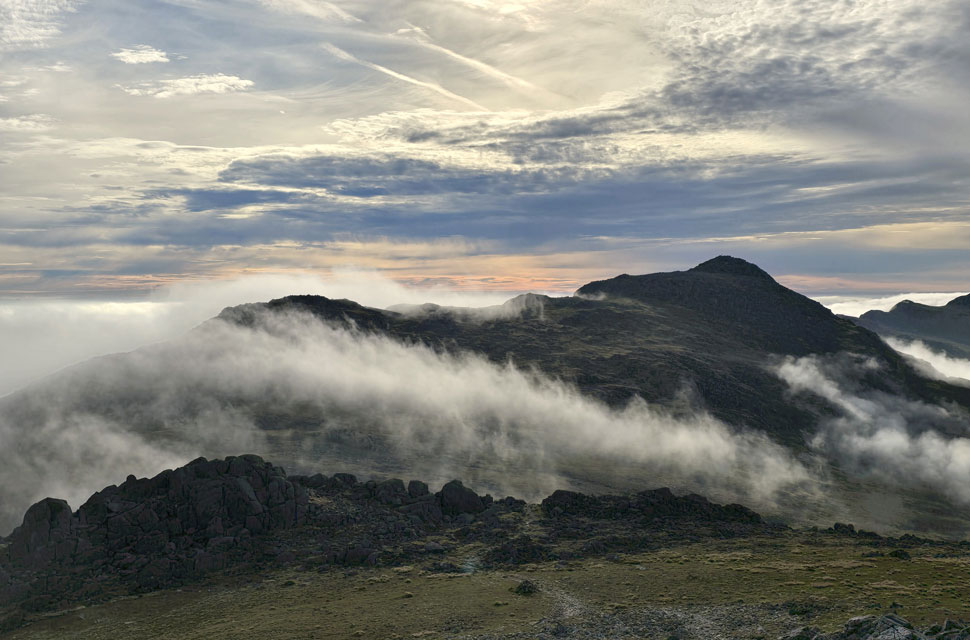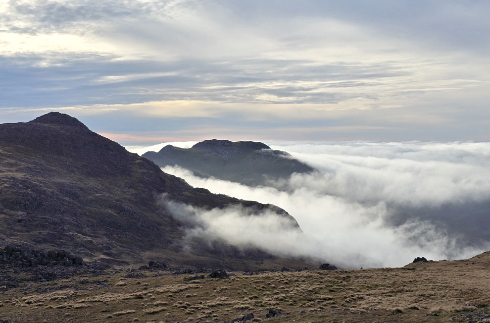 | It was from our ascent of Esk Pike where we treated to some really special views of the inversion advancing on Bow Fell and the Crinkles. |