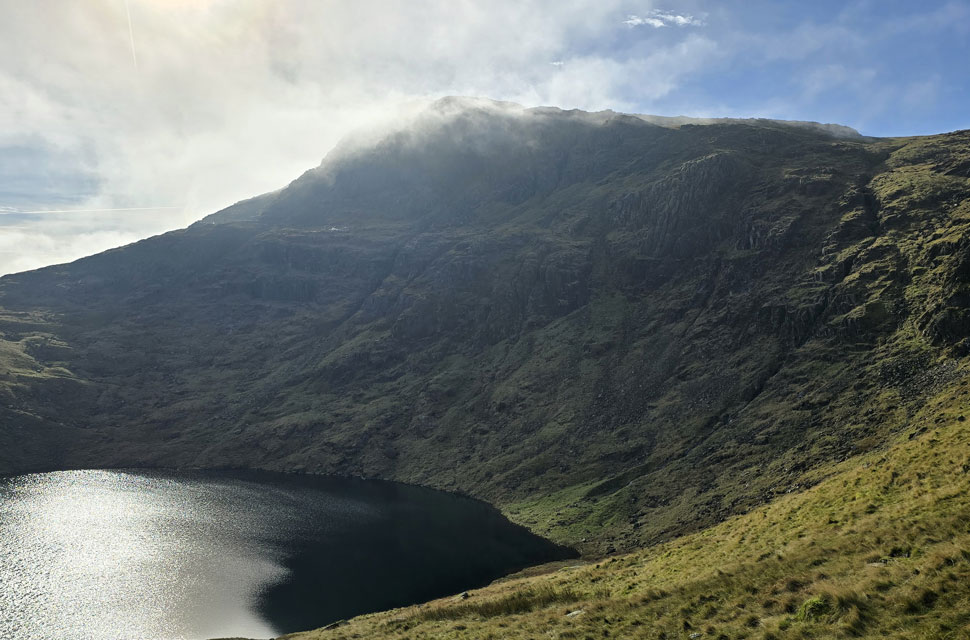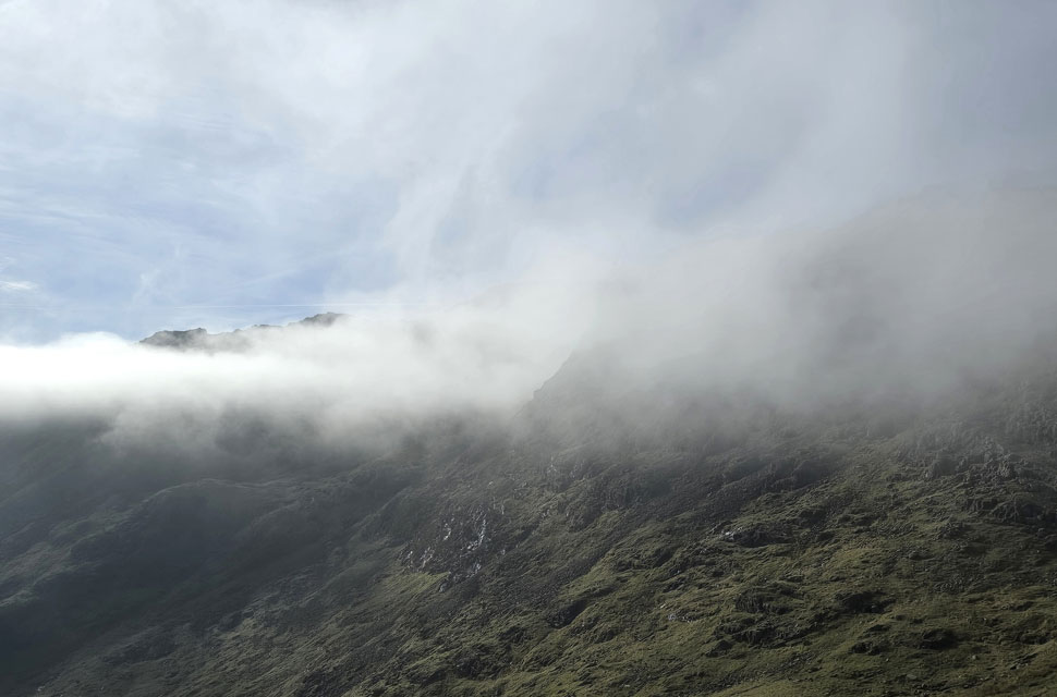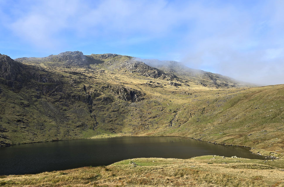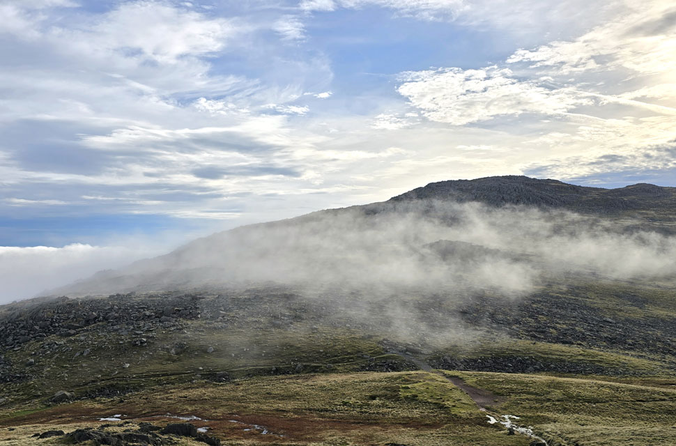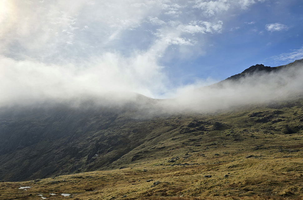 | We were both in agreement that we weren't going to see a cloud inversion, that was until we spotted wisps of thin cloud pouring over the area above Three Tarns, these wisps gradually began to thicken then as we began our ascent on the Climbers Traverse we were treated to the wider view. |