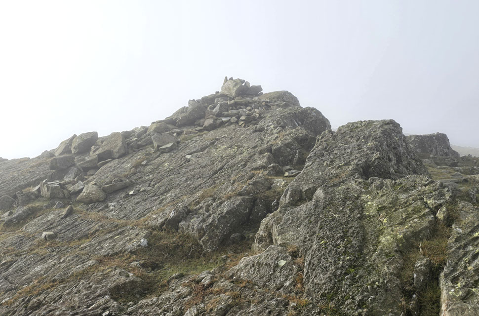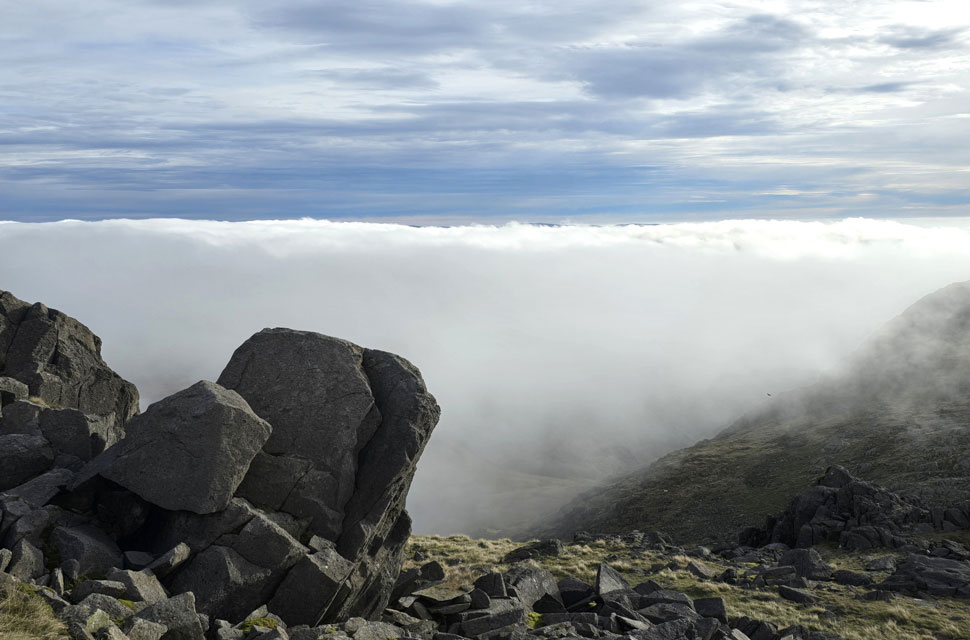 | It was an enjoyable ascent over rough path and boulder before the top of the Great Slab was reached from where we got our answer, Bow Fell's summit for now, was not below the inversion. |