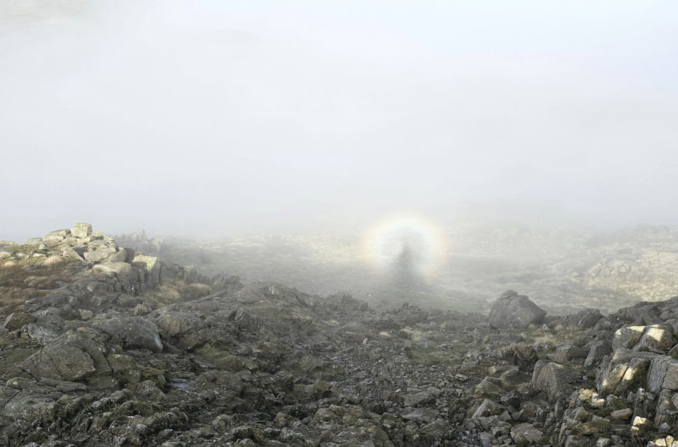 We arrived at Esk Hause in near zero visibility only the sound of chatter from distant walkers heading for Scafell Pike breaking the silence. We were deep in the inversion now which shifted in depth sometimes allowing the sunlight to penetrate through, others were proper in the thick of it. We passed the cross shelter at Esk Hause around the same time a young girl arrived who stopped to add a layer before we began the short, rocky ascent on Allen Crags where through the cloud another girl appeared with her two dogs either side.