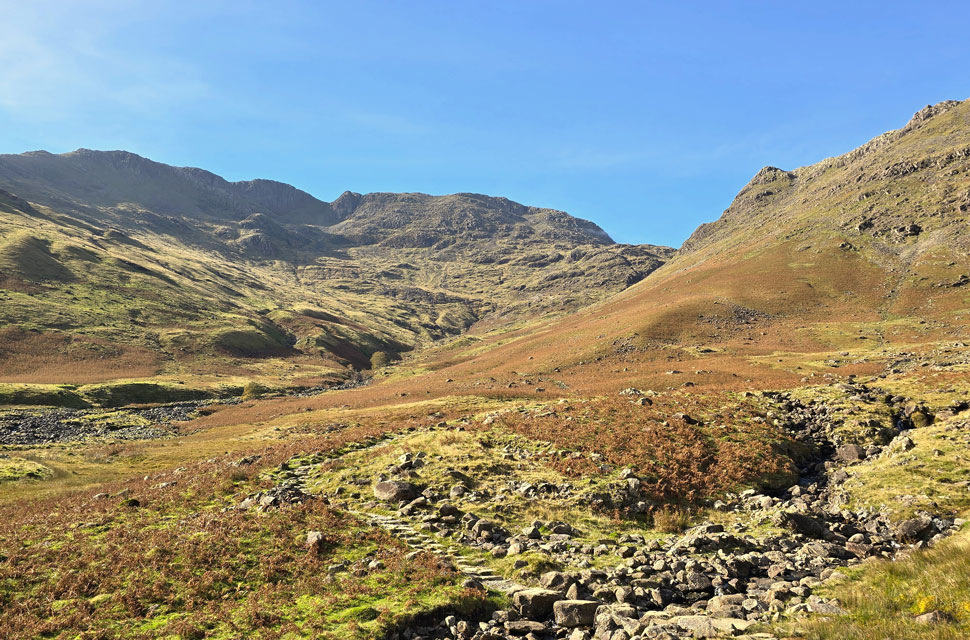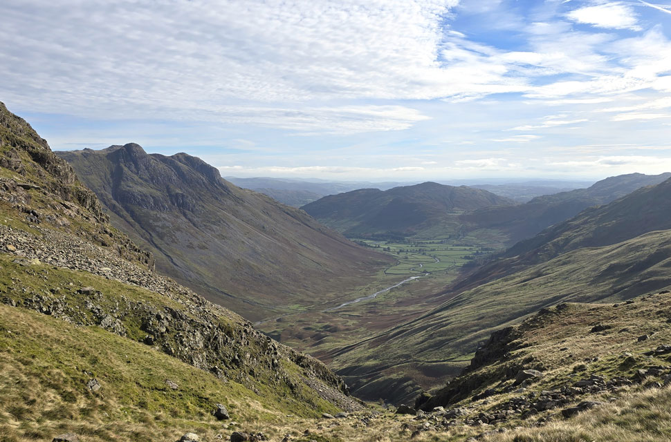 We advised them and left them to it. We were nearly down now feet feeling weary but still generally in good spirits whilst shaking our heads at what had just happened. We reached the junction where both Rossett Gill and Stake Gill forms Mickleden Beck and crossed the footbridge the blue skies and sunshine making it feel like the middle of July rather than the beginning of October. We left the rocky embankment of Mickleden Beck behind and joined the smooth grassy valley floor lapping up each step whilst taking in the surrounding scenery. While David had de-layedered a while back I still had my hoodie on and I was beginning to overheat but it made sense not to stop as we were so close to the cars. Great Langdale looked vibrant in the autumn sunshine as we left the valley behind flanked by The Band on one side and the distant voices of climbers on Raven Crag on the other. |