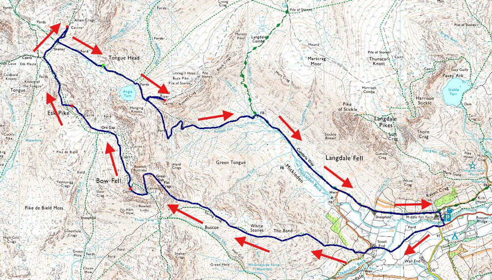 ODG - Stool End Farm - The Band - Climbers Traverse - Great Slab - Bow Fell - Ore Gap - Esk Pike - Esk Hause - Allen Crags - Esk Hause - Tongue Head - Angle Tarn - Rossett Pike - Rossett Gill - Cumbrian Way - ODG |