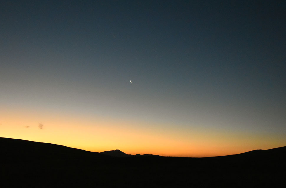 | As your probably aware I'm partial to starting my walk well before sunsrise but today the plan was to start around sunrise just so I can capture first light as it passes over Burnmoor Tarn before flooding the Wasdale Valley in glorious sunlight. It's gotta be a clear morning and if conditions continue it looks like I'm gonna get my wish. This photo was taken just as I joined the Birker Fell road looking back on Stickle Pike with a Waning Crescent moon still visible in the dawn sky. |