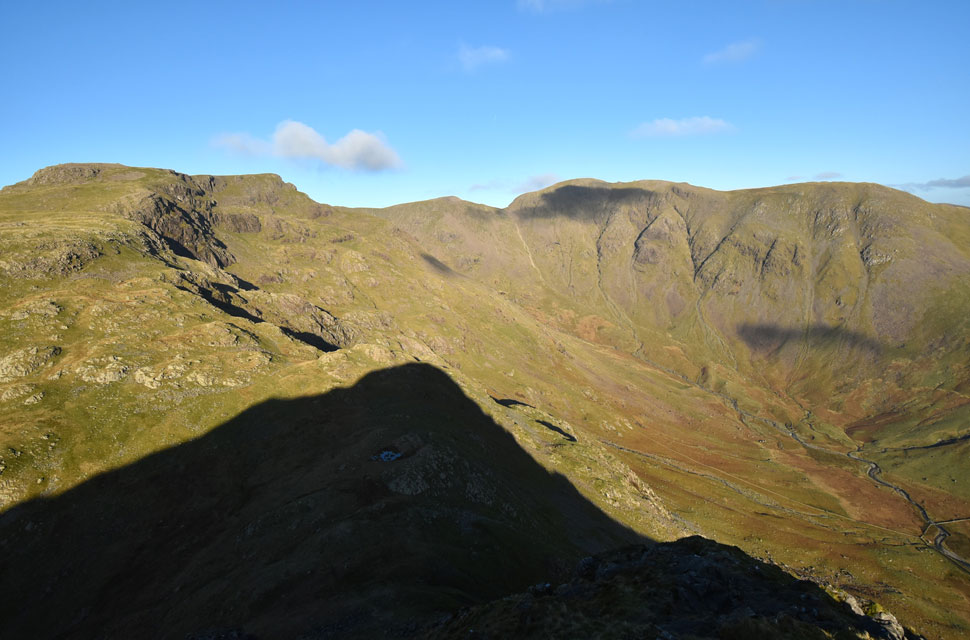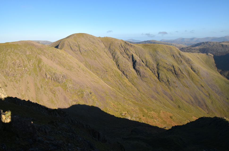 | Looking down on Low Red Pike with the Mosedale Valley flanked by Kirk Fell beyond. |