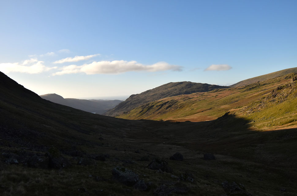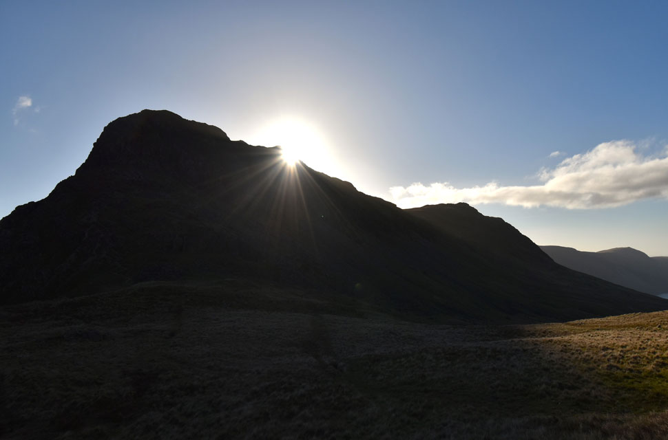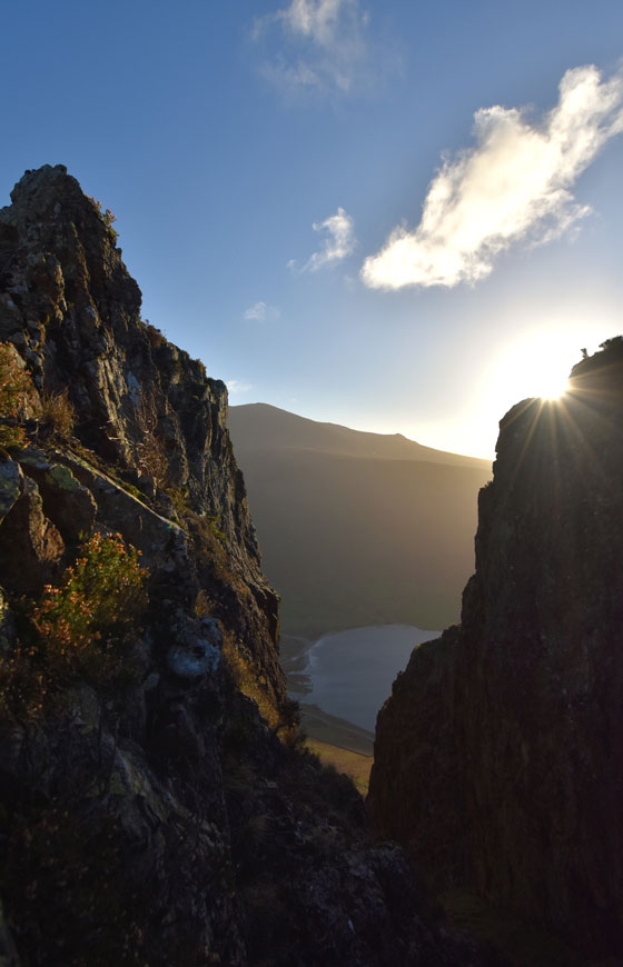 | With all of the technical stuff behind me I got stuck into the remainder of the ascent blinded by sunlight in the corner of my right eye which in turn began to water but the plummeting temperatures will soon freeze the tears. Joking aside, that view, and another we'll see in a short while are the reasons I love climbing Yewbarrow in November. |
