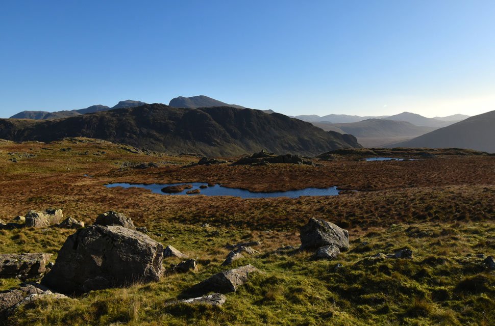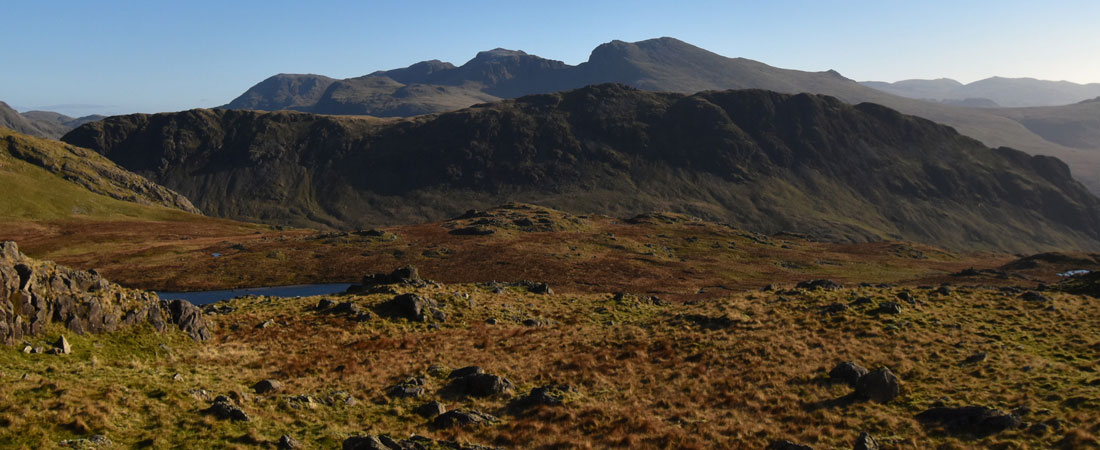 | Sun soaked views over Burnmoor Tarn towards Harter Fell (Eskdale) the Birker and Ulpha fells. |