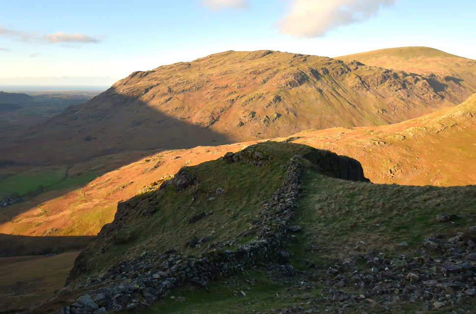 | Looking down on Dropping Crag with Middle Fell and Seatallan in the distance. |