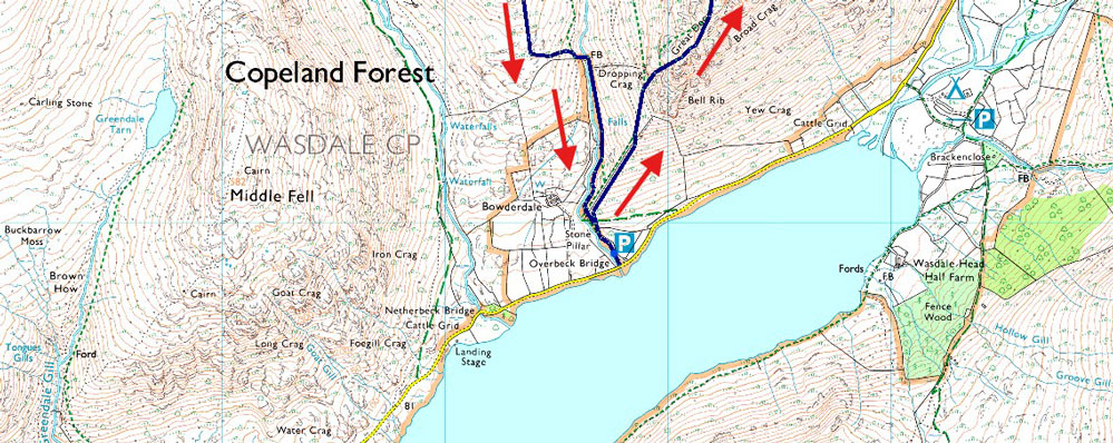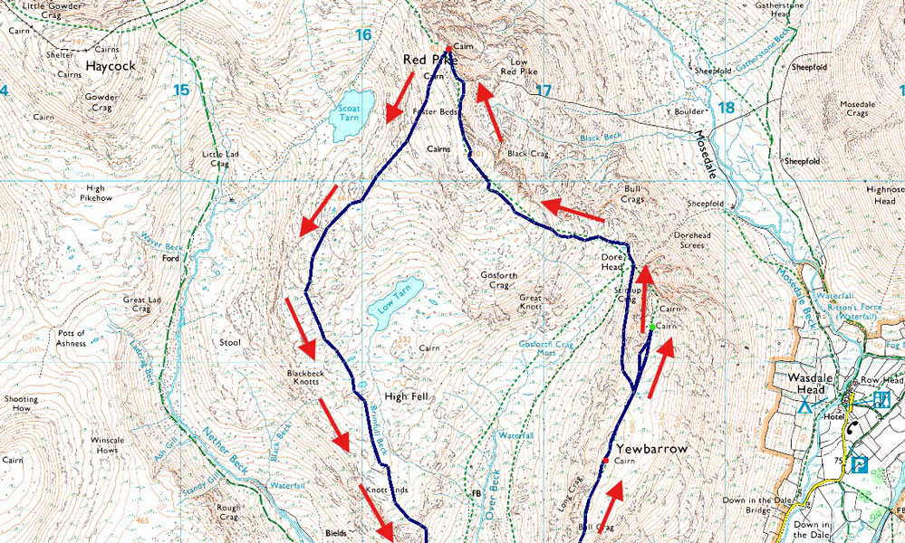 Overbeck Bridge - Dropping Crag - Bell Rib - Great Door - Yewbarrow - Yewbarrow North Top - Dore Head - Red Pike (Wasdale) - High Fell - Blackbeck Knotts - Knott Ends - Over Beck - Overbeck Bridge |