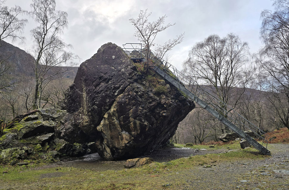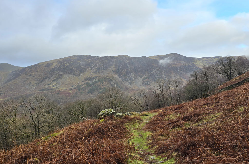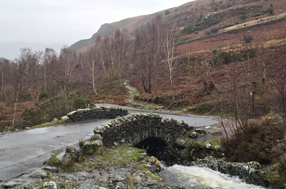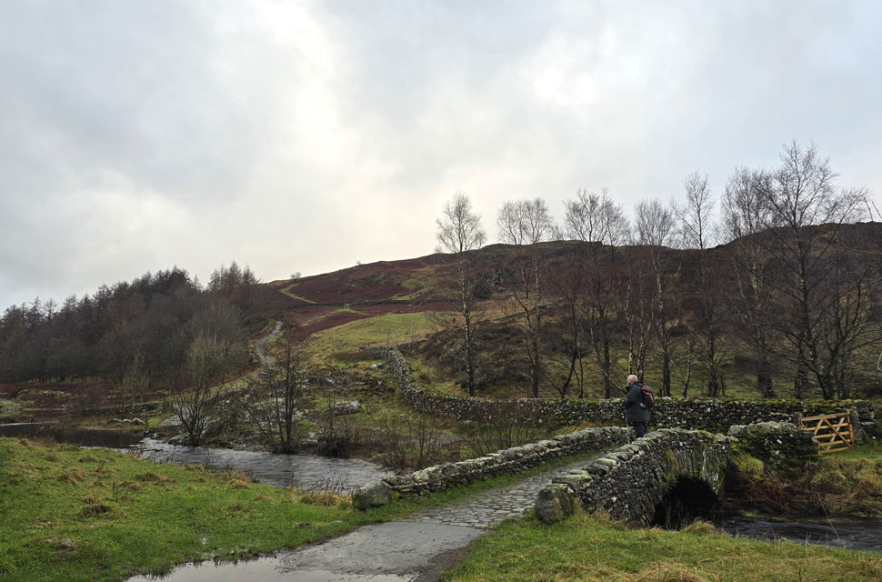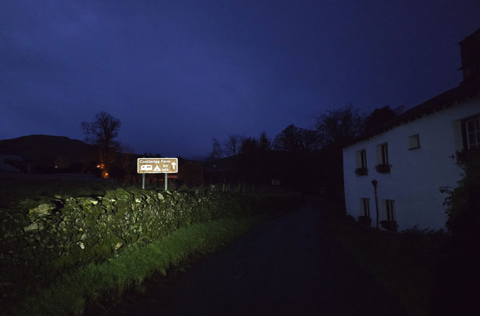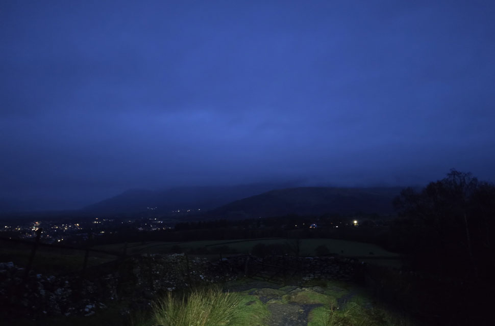 Locking the car we headed north towards Castlerigg Farm the drizzle highlighted through the beams of our head torches the silence of the morning interrupted by Brockle Beck in white spate over to our right. We passed the farm and arrived at the bridge spanning the beck where during the summer you can actually cross via a series of stepping stones without getting your boots wet but after days of heavy rain there was no sign of the stones and we crossed via the wooden footbridge before joining the path for Walla Crag. |
