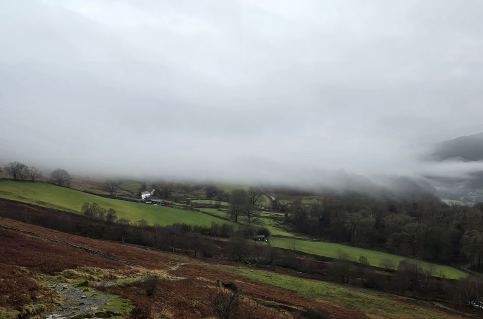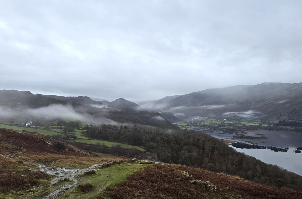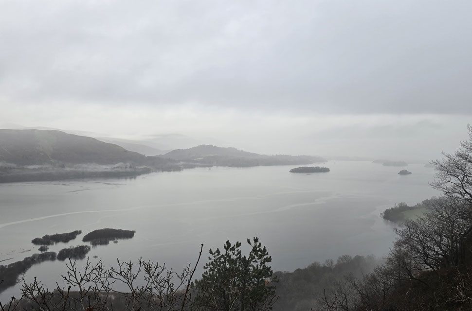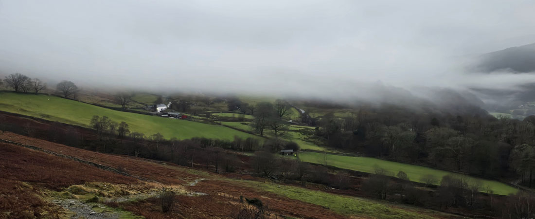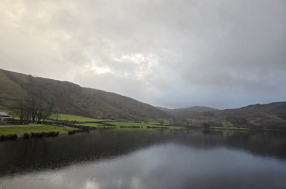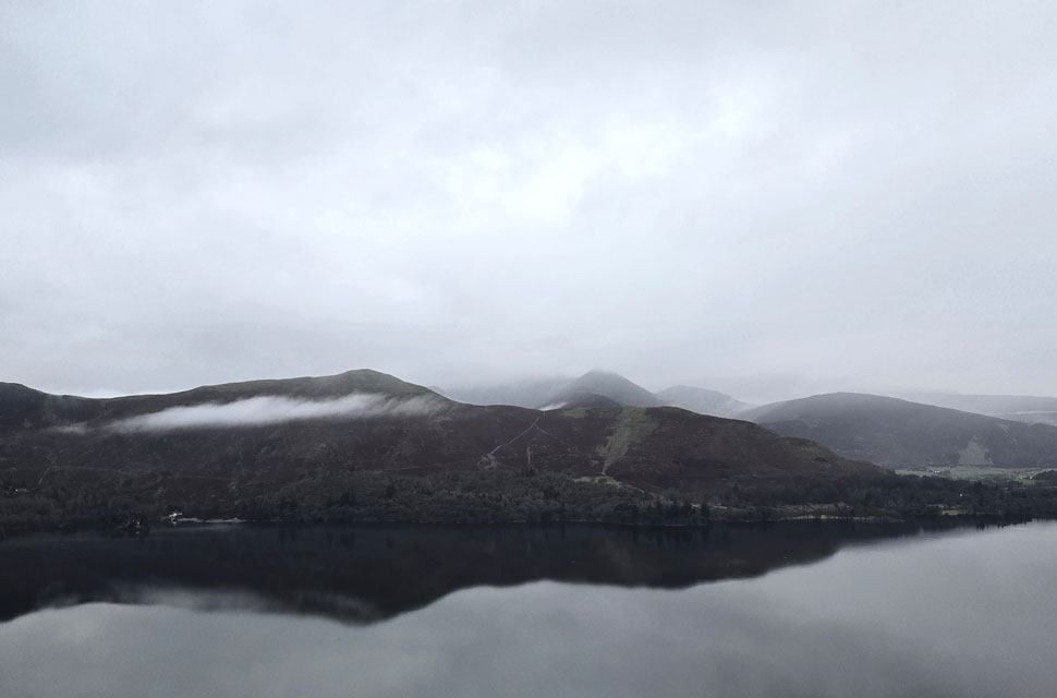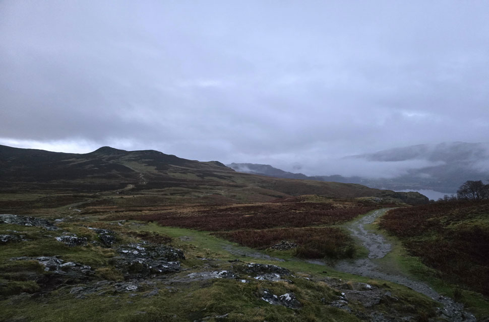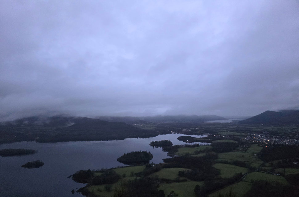 Despite a forecast of persistent rain for the duration David and I put together a low level walk using two cars from Rakefoot just outside Keswick to Grange in Borrowdale taking in Walla Crag and Grange Fell along the way. The original route would have extended to Castle Crag via New Bridge and The Cumbrian Way but after one look how full Derwent Water looked we changed the route just in case the River Derwent had burst its banks outside Rosthwaite and New Bridge, a decision that we later learned needn't have been made but,,, thinking ahead and all that. I met David outside Grange Methodist Church at about 6:55am, swapped my gear into Davids car (remembering my jacket this time) before heading back to Keswick and Rakefoot thereafter. It was still pitch black and an hour away from sunrise when we parked up, half way up the lane not far from Heights Hotel/Guest House we kitted up in misty drizzle into full waterproofs.