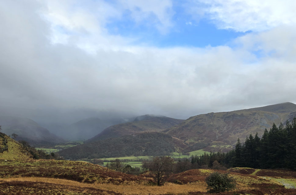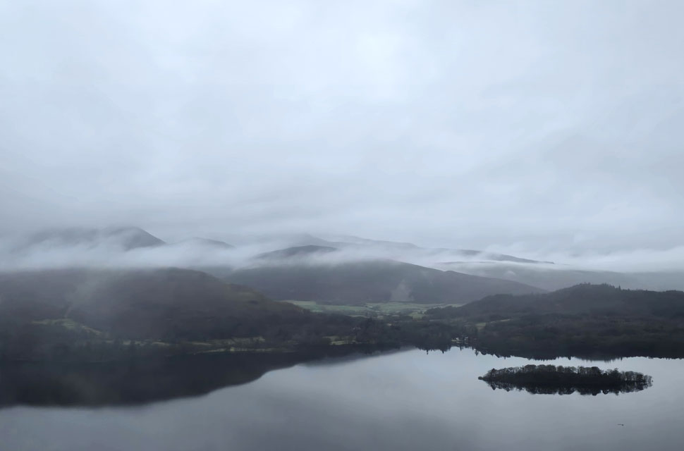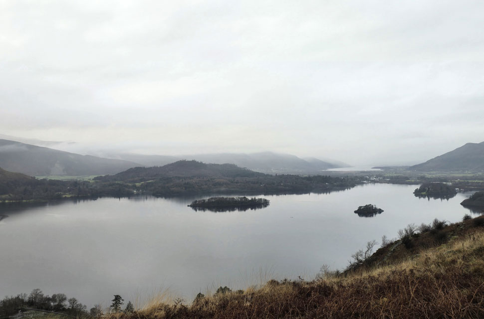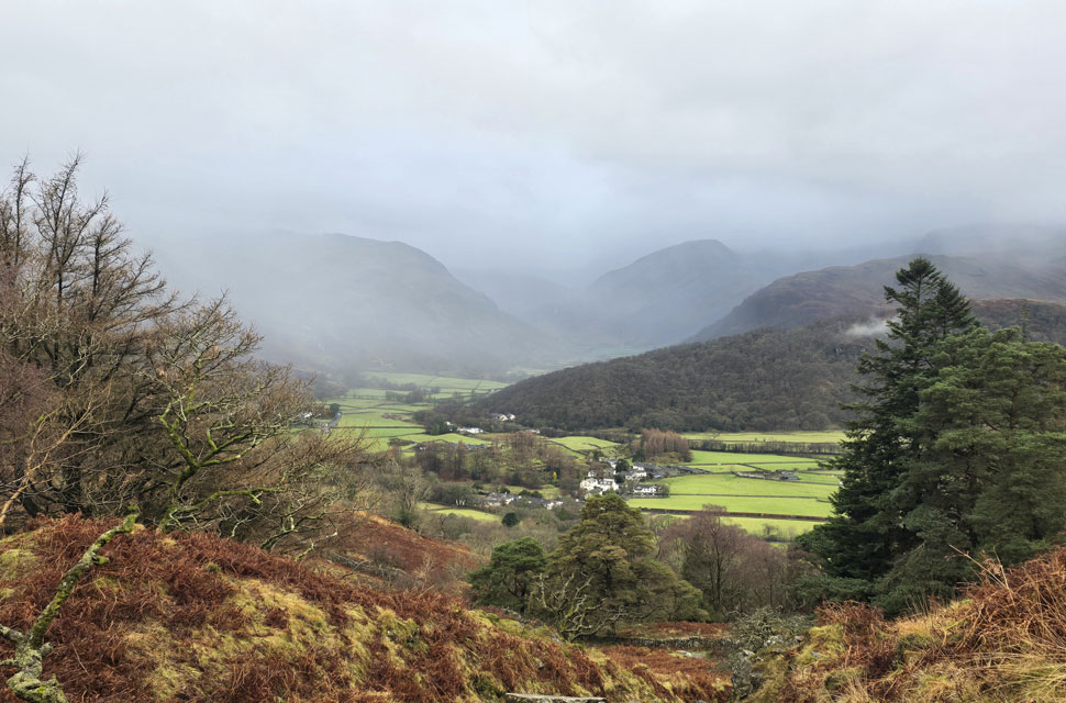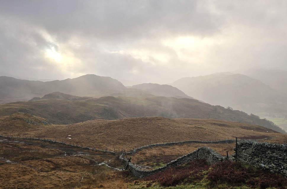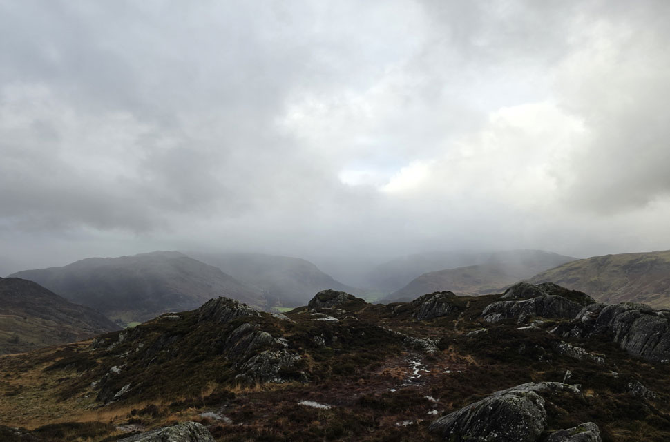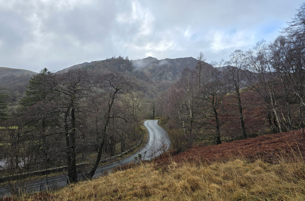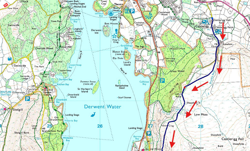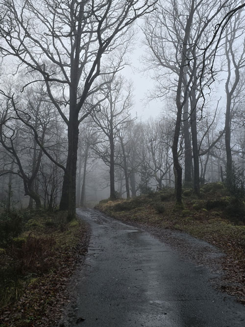 Despite a forecast of persistent rain for the duration David and I put together a low level walk using two cars from Rakefoot just outside Keswick to Grange in Borrowdale taking in Walla Crag and Grange Fell along the way. The original route would have extended to Castle Crag via New Bridge and The Cumbrian Way but after one look how full Derwent Water looked we changed the route just in case the River Derwent had burst its banks outside Rosthwaite and New Bridge, a decision that we later learned needn't have been made but,,, thinking ahead and all that. I met David outside Grange Methodist Church at about 6:55am, swapped my gear into Davids car (remembering my jacket this time) before heading back to Keswick and Rakefoot thereafter. It was still pitch black and an hour away from sunrise when we parked up, half way up the lane not far from Heights Hotel/Guest House we kitted up in misty drizzle into full waterproofs.