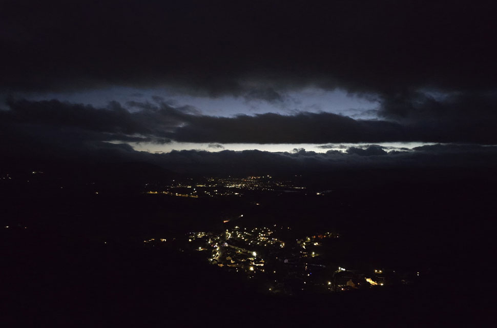There was only one other car in the car park, and with no signs of its owner, I began my kit up scrounging for somewhere dry to lace up, owing to a mix of clay-mud and rotten leaves underfoot, before carrying my boots over to the base of the wooden staircase, where I swapped my mids for my boots. The odd car broke the silence as it made its way up Whinlatter Pass before silence resumed. Despite loving the early starts, kitting up in the pitch black still feels eerie, more so when surrounded by woodland, and I was eager to get underway. At exactly 7:00am, I locked the car and returned to the staircase for the steep ascent on Kinn, and with height gained, the silence was broken again by traffic travelling on the A66 below. I stopped more than once to look down on the street lights of Braithwaite and Keswick, even spotting head torches on the shoulder of Blease Fell, but it was so dark it was difficult to tell where the cloud line started. One thing I did know was that both Skiddaw and Blencathra's summits were below cloud. The bad news was I couldn't see Grisedale Pike summit from below Kinn, but the good news was I could see stars in the sky directly above so keeping fingers crossed, I marched on towards Kinn. |