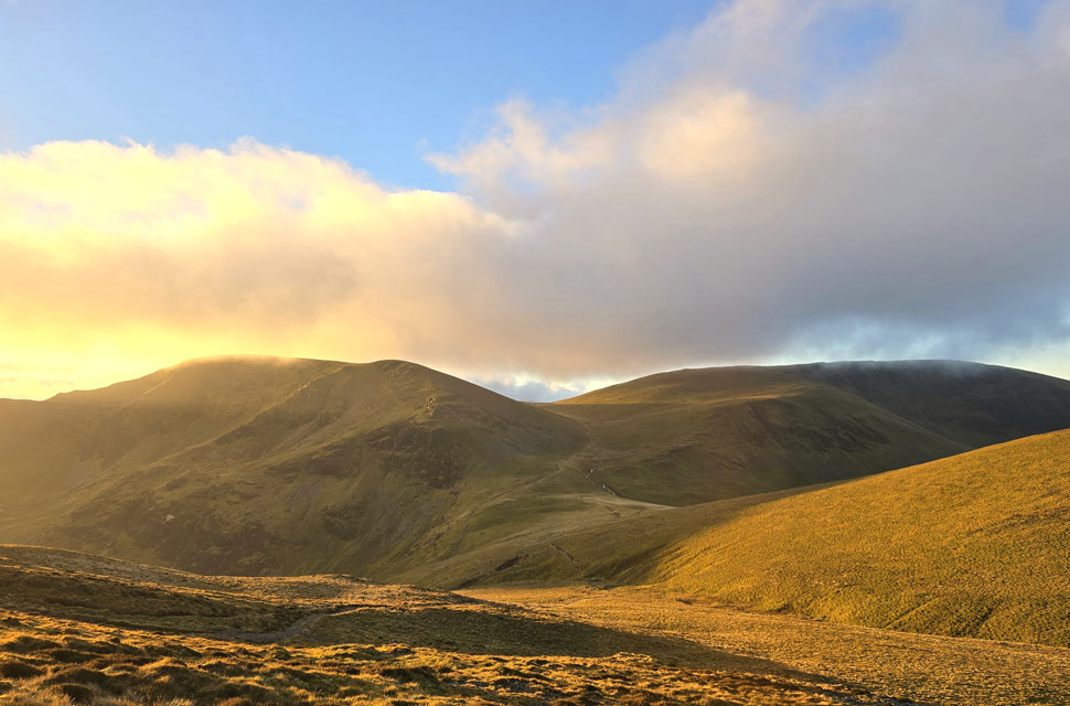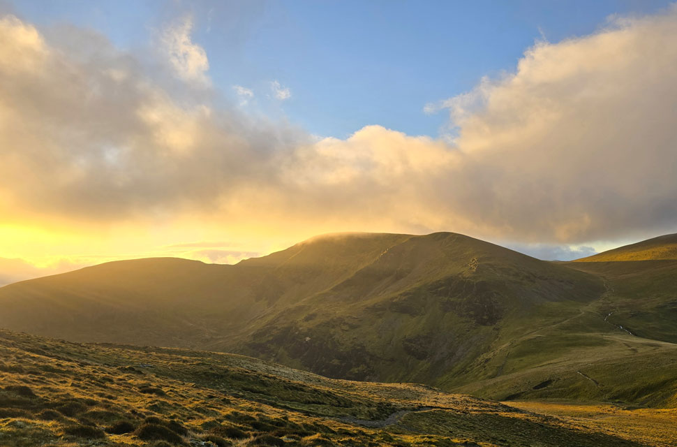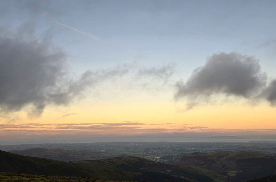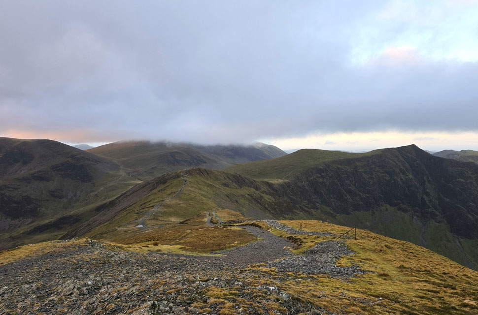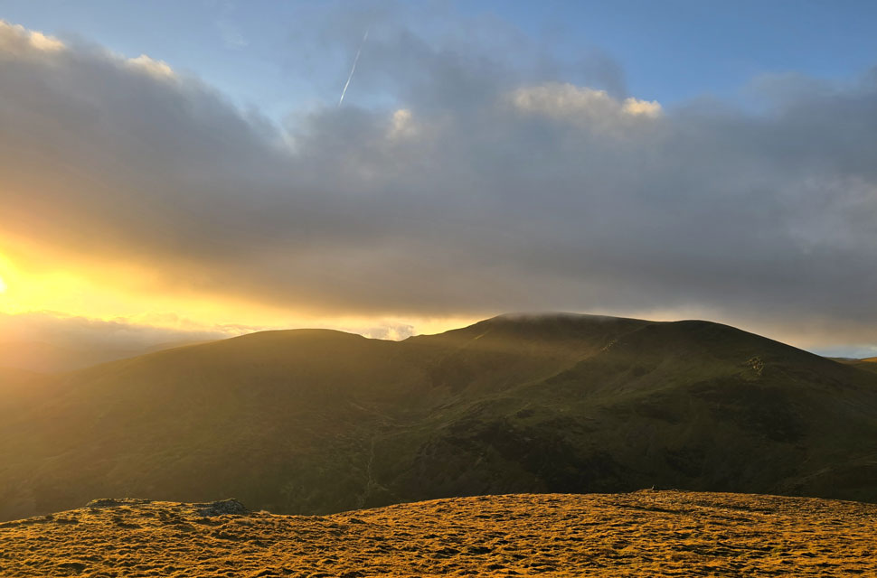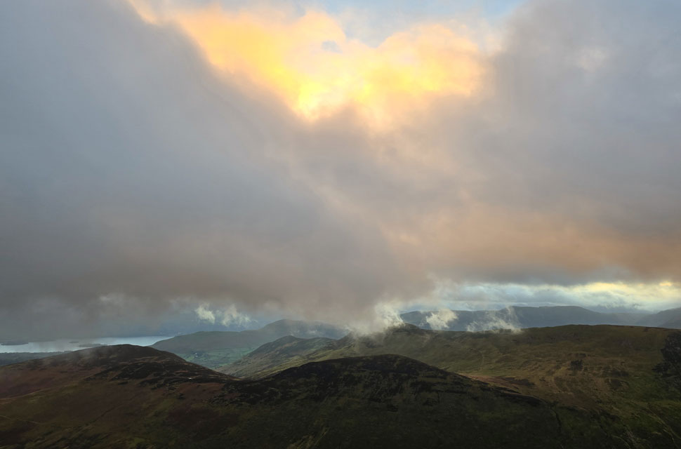 | When I reached the top of Sleet How, I saw that the dawn light showed more clouds than the forecast from three hours earlier. I checked the Met Office App and, sure enough, the forecast had changed again. At first, I felt frustrated, but after a few minutes I let it go, shrugged, and reminded myself how lucky I was just to be here. |