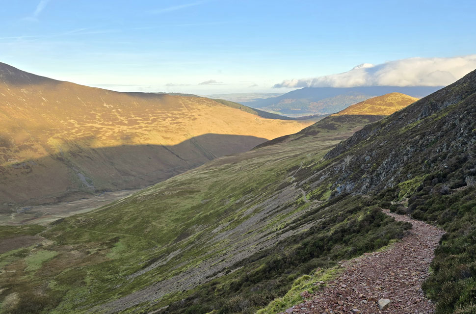 The moment I began my descent on Sail Pass, all went quiet, and for the first time, my gloved hands felt clammy, so I removed them to reveal hands like they'd been in the bath too long. The cool air did a great job of returning them to normal, gripping my pole handles over what can only be described as a fabulous descent. I soon arrived at the fork in the path where I turned left and began my descent into Coledale, the silence now overpowered by Low Force falls below Force Crag. I was descending into shade, and the temperature drop was felt before arriving at Coledale Beck, which I crossed to the amusement of three onlookers via four stepping stones, all but one, submerged.