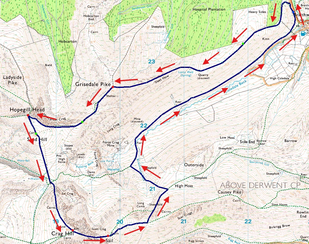 Car Park, Whinlatter Pass - Kinn - Sleet How - Grisedale Pike - Hobcarton Head - Sand Hill - Coledale Hause - Eel Crag - Eel Crag (Crag Hill) - The Scar - Sail - Sail Pass - Coledale Beck - Coledale - Car Park, Whinlatter Pass |