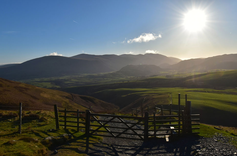 | Sun dazzling views towards High Rigg, St John's-in-the-Vale, Clough Head, The Dodds and the Helvellyn range. |