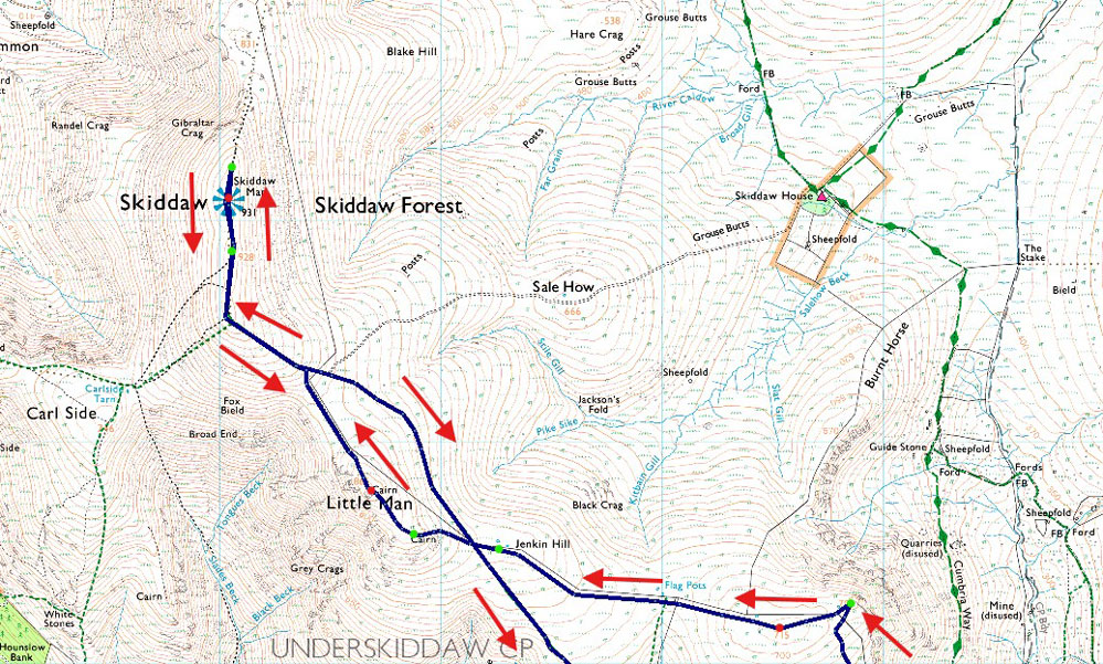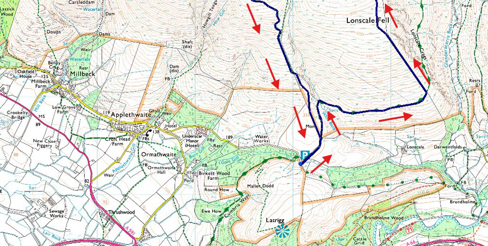 Gale Road Car Park - Whit Beck - Lonscale Pike East Top - Lonscale Fell - Jenkin Hill - Lesser Man - Little Man - Skiddaw South Top - Skiddaw - Tourist Path - Gale Road Car Park - Hawell Monument - Gale Road Car Park |