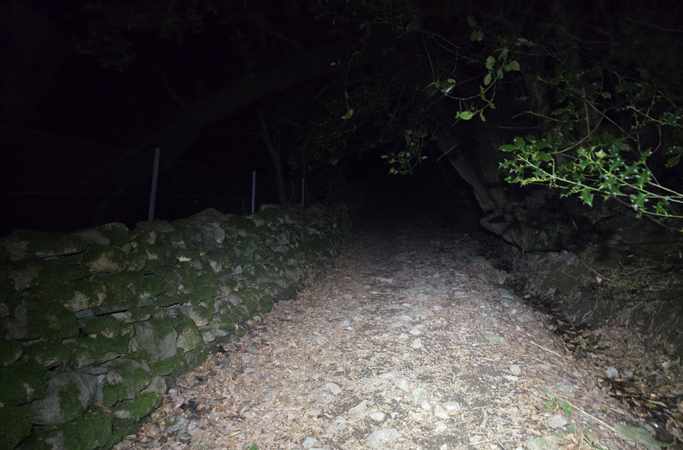 | I switched my head torch off and let my eyes adjust to the darkness spotting three or four head torches ascending Nab Scar, seen far left. The bright light you see through the trees is from the headlights of a car which had parked up on The Struggle above Ambleside. |