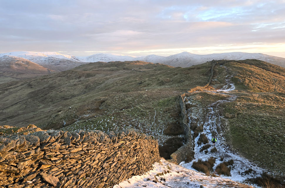 | More people began to arrive, most having just missed what I considered to be one of the best sunrises I'd seen, but aren't they all! We returned to the stone wall where we'd left our gear, looped hands into our poles and descended north towards Baystones, seen at the end of the knobbly ridge. |