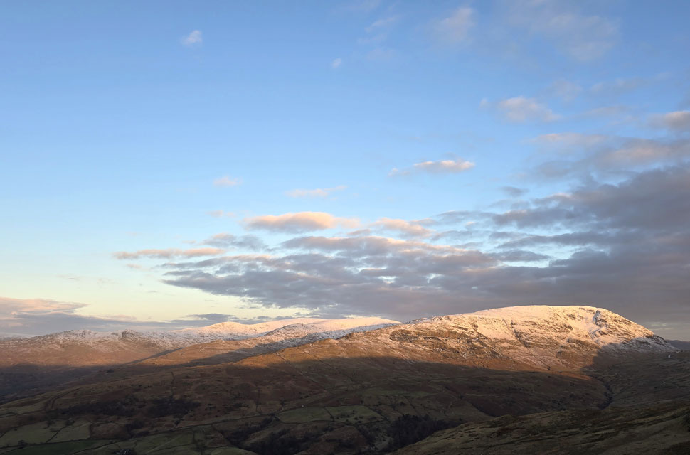 | The pre-light of dawn revealed snow-capped peaks as far south as the Coniston and Langdale fells, with Loughrigg Fell and Lingmoor Fell in the foreground snow-free. Dawn also revealed more cloud than we'd anticipated, a lot of which was capping the Scafell group. |