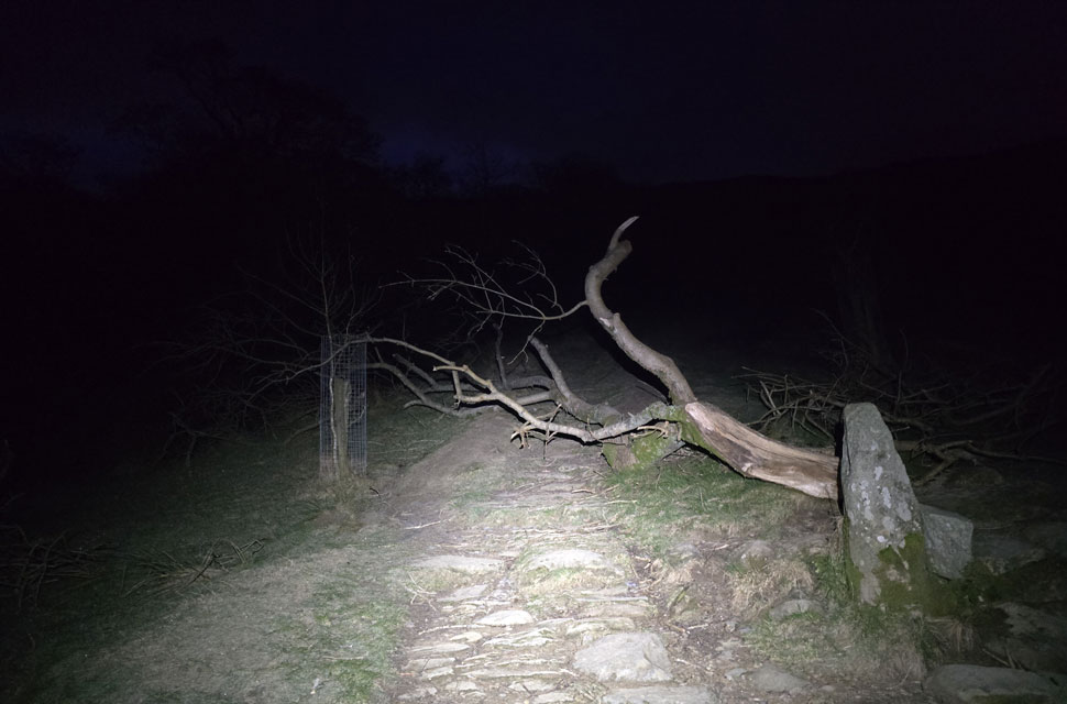 We followed the track leaving the lights of Ambleside behind in the pitch darkness, flanked by the odd light from Kelsick Grammar School on the other side of a stone wall to our left. The track was bone dry, but care had to be taken due to long stretches of ice which our head torches were illuminating well ahead. It didn't take long to reach the footpath below Wansfell Pike which was blocked by a fallen tree.