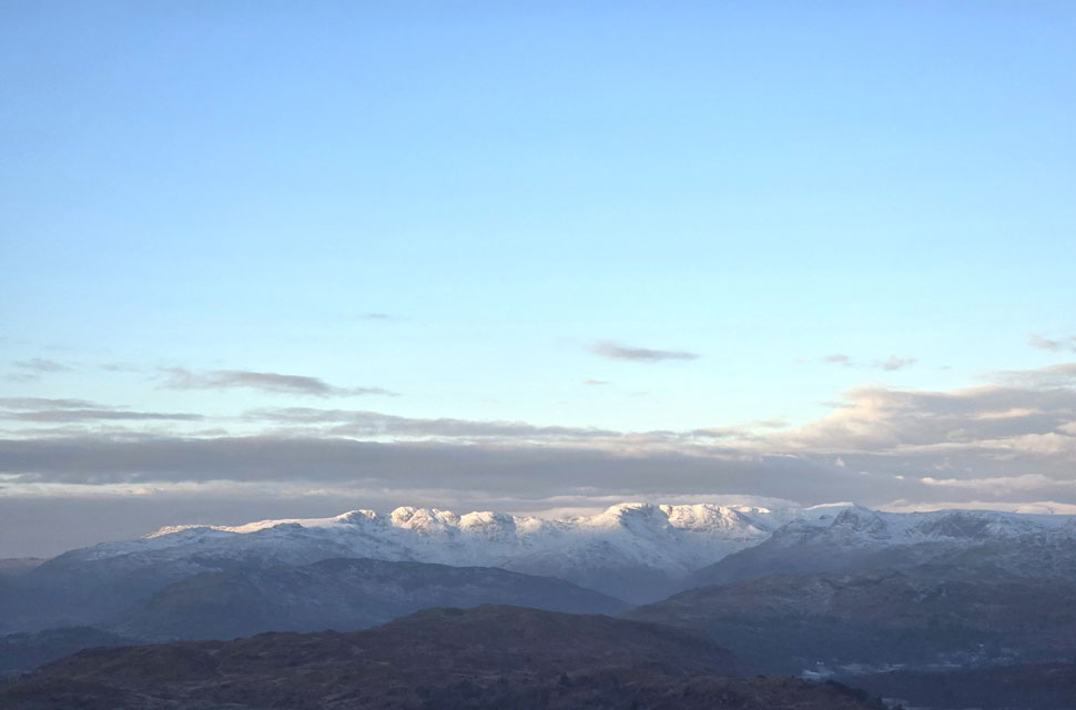| ....the snow capped peaks of Crinkel Crags and Bow Fell. If you squint you might be able to make out that layer of cloud over the Scafells I mentioned earlier. |