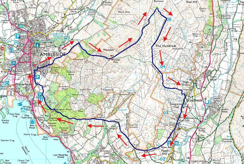 Old Lake Road, Ambleside - Blue Hill Road - Wansfell Pike - Wansfell (Baystones) - Nanny Lane - Troutbeck - Robin Lane - Low Skelghyll - High Skelghyll - Skelghyll Wood - Old Lake Road, Ambleside |
