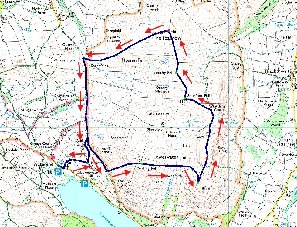 Waterend - Mosser Fell Road - Miresyke - Darling Fell - Crabtree Beck - Loweswater Fell - Low Fell - Sourfoot Fell - Smithy Fell - Fellbarrow - Mosser Fell Road - Waterend |