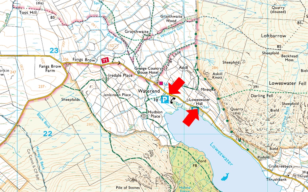 An alternative to parking in the village of Loweswater the roadside parking at Waterend offers parking for up to a dozen cars on both sides of the road. Waterend gives excellent access to the whole of the Loweswater Fells, Mosser Road or even just a wander around the Lake itself. Parking is free at both sites. |