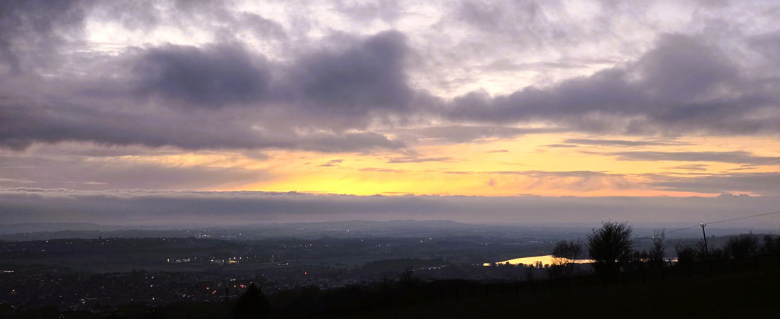| It's been a frustrating weekend with a poor forecast keeping me away from the high fells, and to add insult to injury, while viewing a cloud-topped Skiddaw from the George Fisher webcam this morning, there was plenty of blue sky and even sunshine on the lower slopes, the exact opposite of what had been forecast. After breakfast I took Brad and Holly on a five-mile walk, tiring out the pair of them, but it did little to curb my frustration, and with a weather window appearing before sunset, I headed out to Wilder's Wood to walk Winter Hill and maybe catch the sunset. |