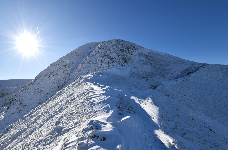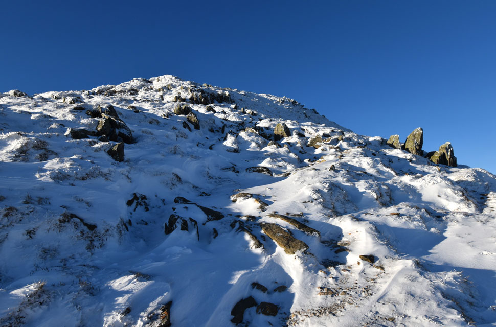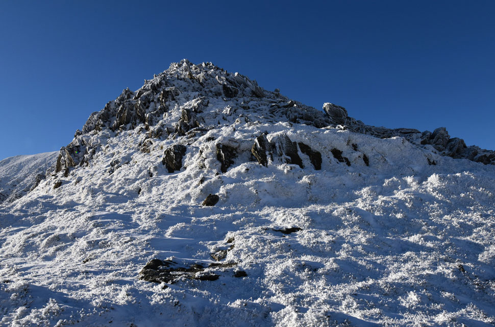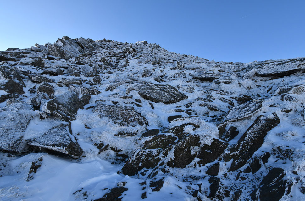 | There is a path that winds its way through the summit crags directly ahead, but I'll be using the much safer path seen towards the right. The path passes below the shoulder, then heads directly onto the summit passing over the frozen patch of snow you can see where my micro-spikes and ice axe definitely came in handy. |
