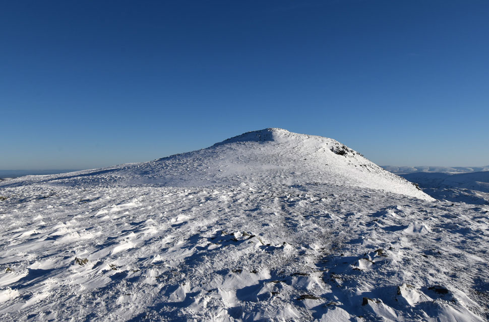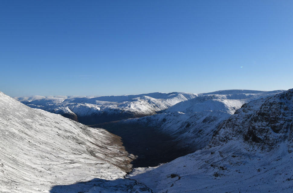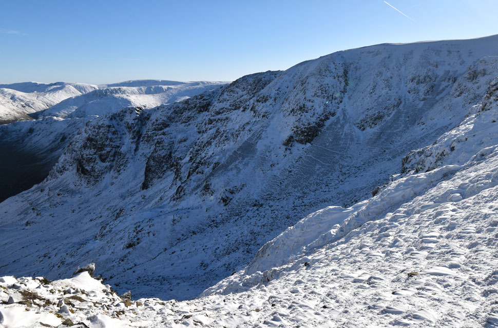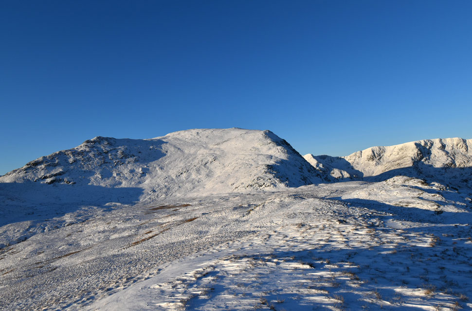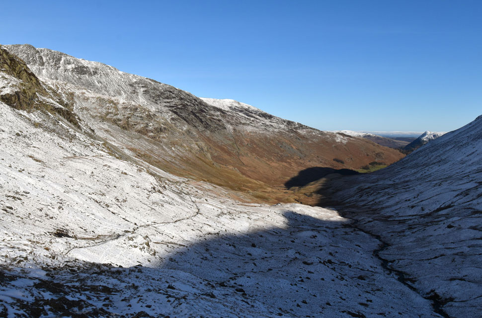 | There was more substantial snow drift as I descended Birks and crossed the col above Blind Cove where I expected the frozen bog to give way but the hard snow held firm before I began my ascent on St Sunday Crag proper. |