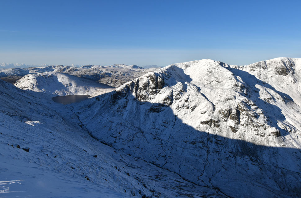 | The vast crags on the east flanks of Dollywagon Pike are Tarn Crag and Falcon Crag with The Tongue ridge in sunshine towards the right. |