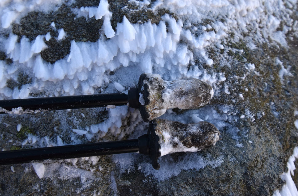 | If ever I needed the hint to get my ice axe out it was the moment the tips of my walking poles had balled-up so hard the ice had set like concrete. |