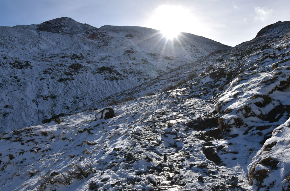 The descent from Fairfield had been relatively quick, and once I reached the stone staircase I hooked a right and began to flank Grisedale Tarn, still amazed at how quiet the place was. The path along the eastern shore was coated in thick ice and there was no let-up until I reached the outflow, where I dipped the tips of my poles into the water in a half-hearted attempt to free them from the ice. It would take a while. I'd followed a solo walker around the tarn, and by now she'd settled among a cluster of boulders, sipping from a flask in the midday sun. For a moment I wondered if I should stop too, if only to take on some fuel, but when I'm walking solo I prefer to keep moving. So I left the outflow behind and began the long descent toward Ruthwaite Lodge, encountering what felt like miles of of ice, bare rock, and repeat. I was still wearing the micro-spikes and told myself I'd only take them off once I reached the lodge, but the pain in the balls of my feet was becoming less than comfortable and the lodge couldn't come soon enough. I passed a couple who looked like they'd stepped straight off the front cover of a mountaineering magazine. They asked about my route, explained they were doing the same in reverse, and I spent the next five minutes answering questions about conditions in rapid fire fashion.