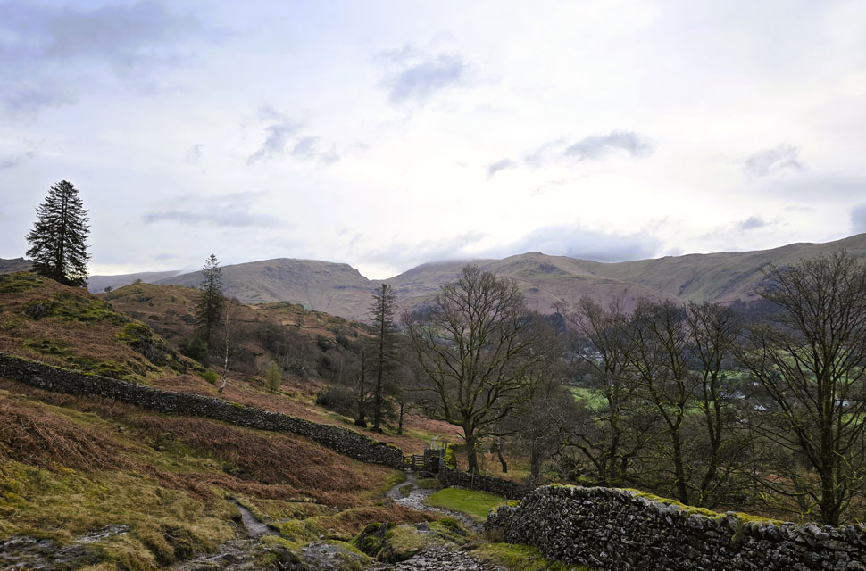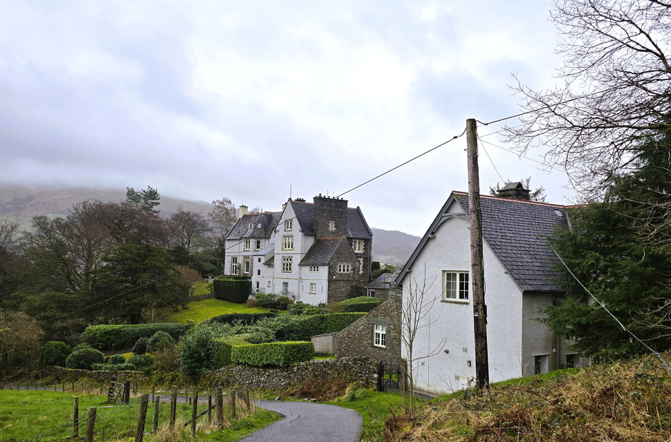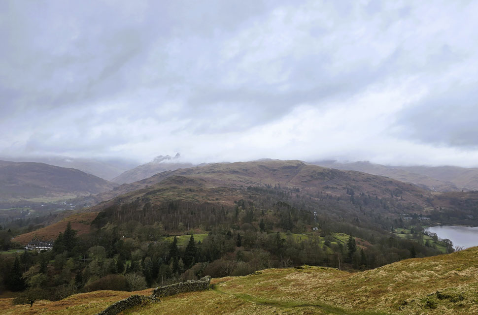 | From the narrow trod we joined the tarmac lane and took in the views towards Elterwater and Chapel Stile, both looking quiet with only the odd car parked on the outskirts of the hamlets. The lane began to climb towards High Close YHA, where we passed a couple walking a Westie. I watched him trot ahead, knowing that Holly and Brad were probably on their fifth snooze of the morning rather than trudging up a drizzly hillside. Good lad, I muttered as the Westie strolled away.