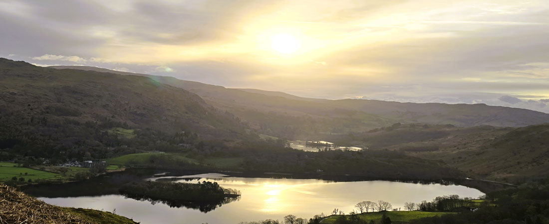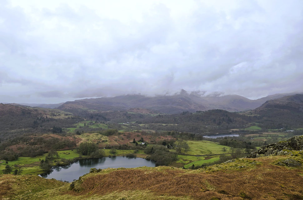 | Views towards a cloud topped Wetherlam with Loughrigg Tarn and Elter Water seen foreground. |