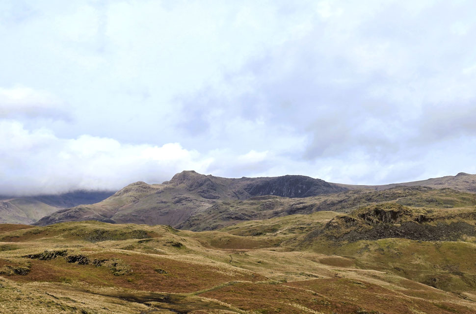 | Views towards Pike O'Blisco, Crinkle Crags, Bow Fell, Loft Crag and Harrison Stickle. |