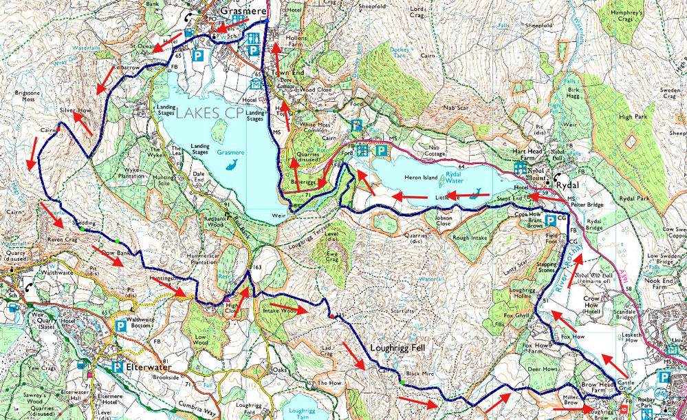 Lay-by A591 - Stock Lane - Red Bank Road - Kelbarrow - Silver How - Spedding Crag - Dow Bank - Traverse Path Below Huntingstile Crag - High Close YHA - Footpath by Intake Wood - Loughrigg Fell - Black Mire - Loughrigg Brow - Miller Bridge - River Rothay - Pelter Bridge - Coat How - Rydal Water - White Moss Common Woods - Footbridge over River Rothay - Penny Rock Woods - Grasmere Lake Weir - Daffodil Hotel - Lay-by A591 |