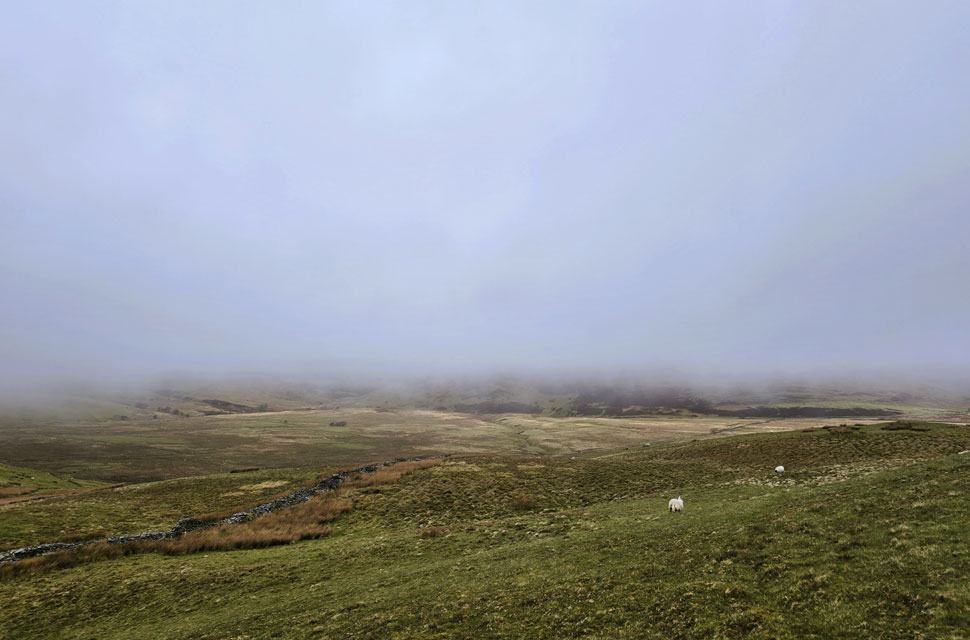 We crossed Widow Hause where we spotted only the second person we'd seen all morning, a young lad descending from Greystones who kindly let us cross the wire fence on the lower slope with a cheery "morning." We hit the steep gradient in good stead, but it wasn't long before I felt my chest tightening again. I let David and Rod pull ahead without them noticing and made it up once the incline eased. We reached Greystones summit and soon sparked into conversation about global news something we're all very much on the same page about and in the swirling mist, we put the world to rights.