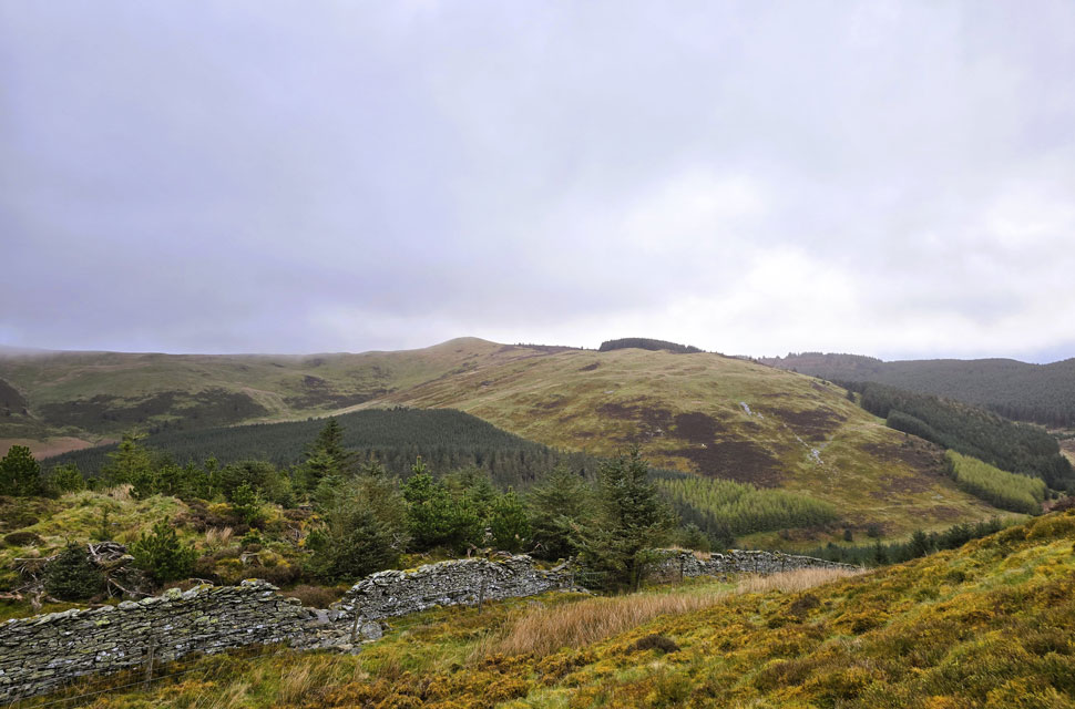 | Continuing along the forestry track, it wasn't long before David spotted the narrow trod cutting across the felled plantation, running almost horizontally towards the stone wall you can see in the lower half of the picture. It was here so early into the walk that I began to flag, allowing both David and Rod to pull ahead while I focused on controlling my breathing while scooping in lungfuls of air. I found the pair waiting for me at the wall where I told them to keep going and that I'd catch up. But being the gents they are, they wouldn't have it and notched it down a gear. |