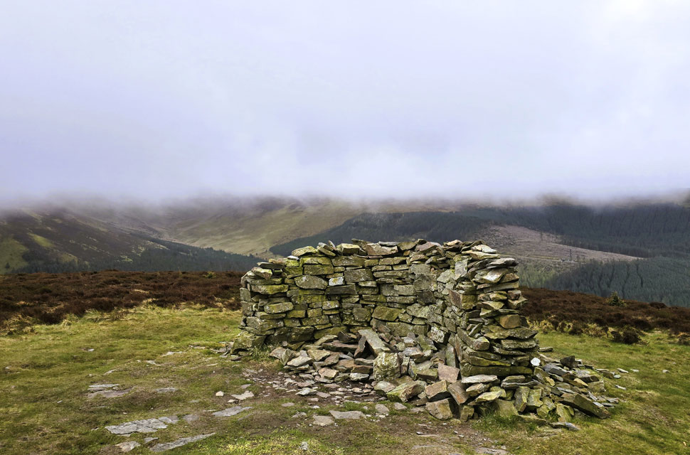 | We left one forestry track for another, descending towards the familiar hair-pin bend where the permissive path for Lord's Seat was just yards away. We stepped off the track and joined the path, walled in by woodland feeling rain in the air first a fine drizzle, then a steady horizontal flow. As we neared the top of the path, with Lord's Seat's summit coming into view from the edge of the treeline, we first had to negotiate a stretch of drenched peat bog. The only way around it was to duck into the woodland, crawling under low branches with more bog squelching underfoot. We eventually emerged on the far side of the mire into gusty winds and horizontal rain. Time to batten down the hatches again. |